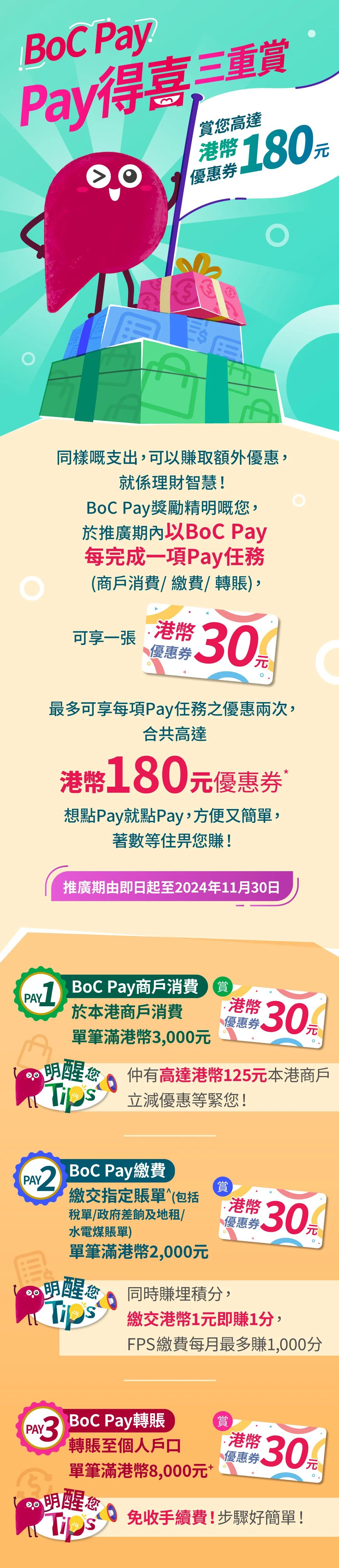 1. BoC Pay 2024年11月繳費推廣(下稱「本推廣」)推廣期為2024年11月11日至11月30日,包括首尾兩日(下稱「推廣期」)。