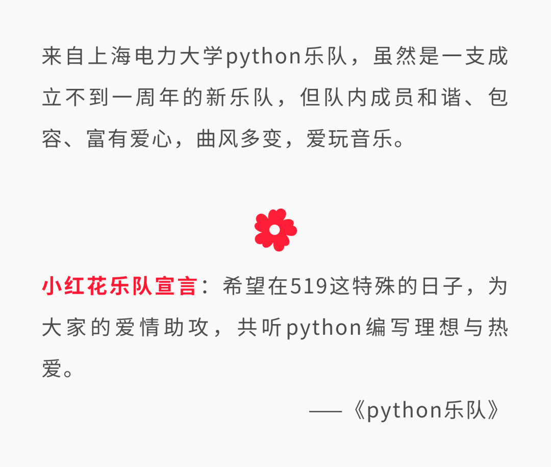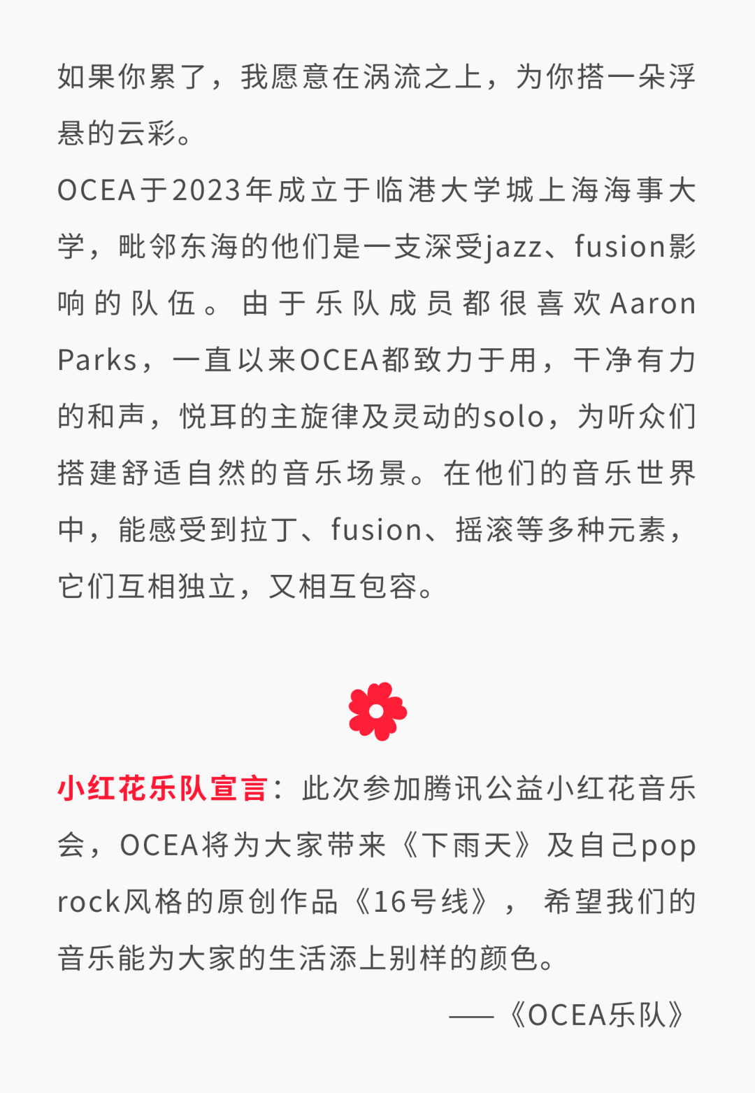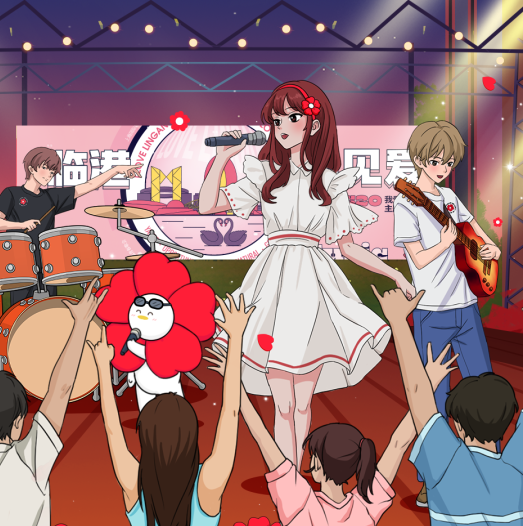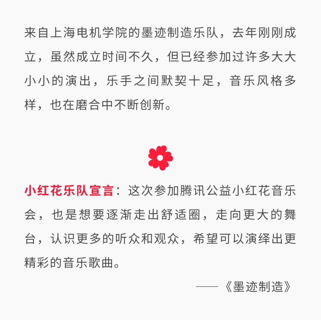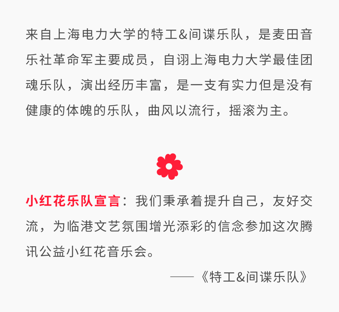 临港腾讯公益小红花音乐会得到了上海各大高校的大力支持,在上海工程技术大学电子电气工程学院×思归乐文创的新媒体创新实践基地和“花YOUNG传播团”的引领和推动下,最终共有5个乐队,3位独立校园歌手,共29位同学,参与到了此次表演中,共同唱响公益之声,把临港的声音唱给世界听。