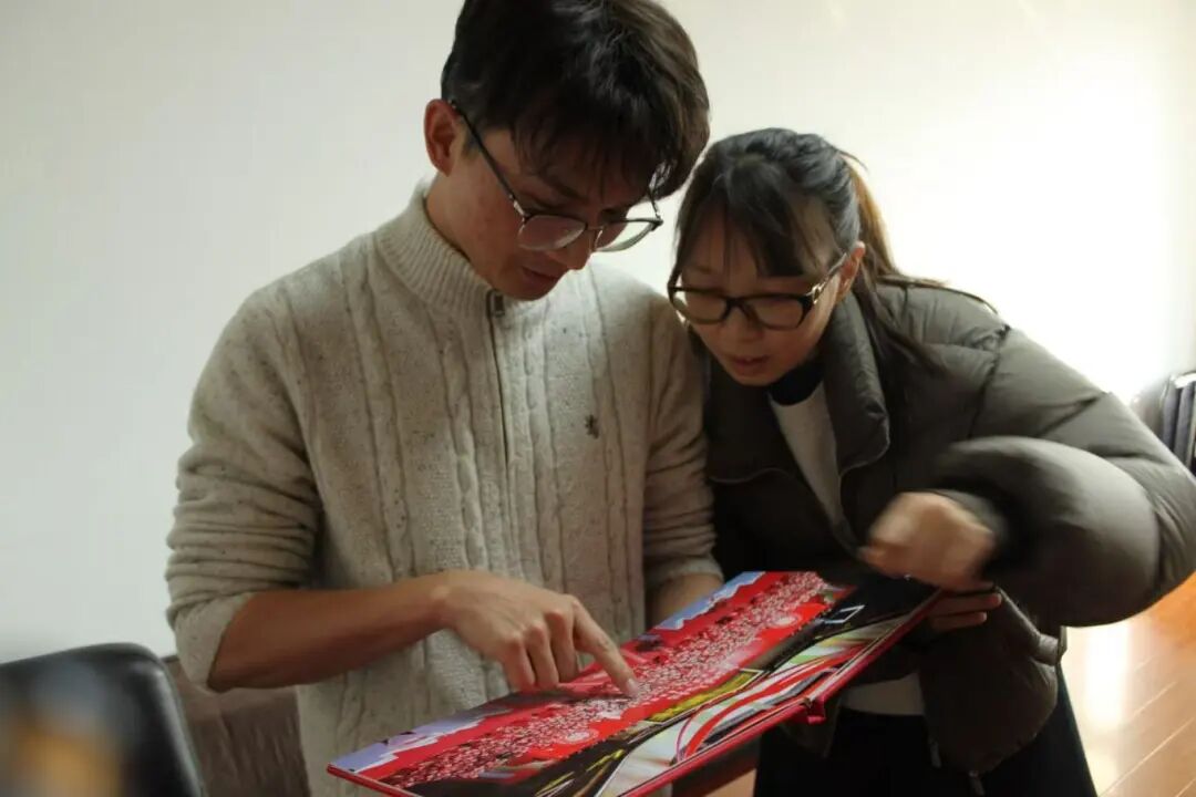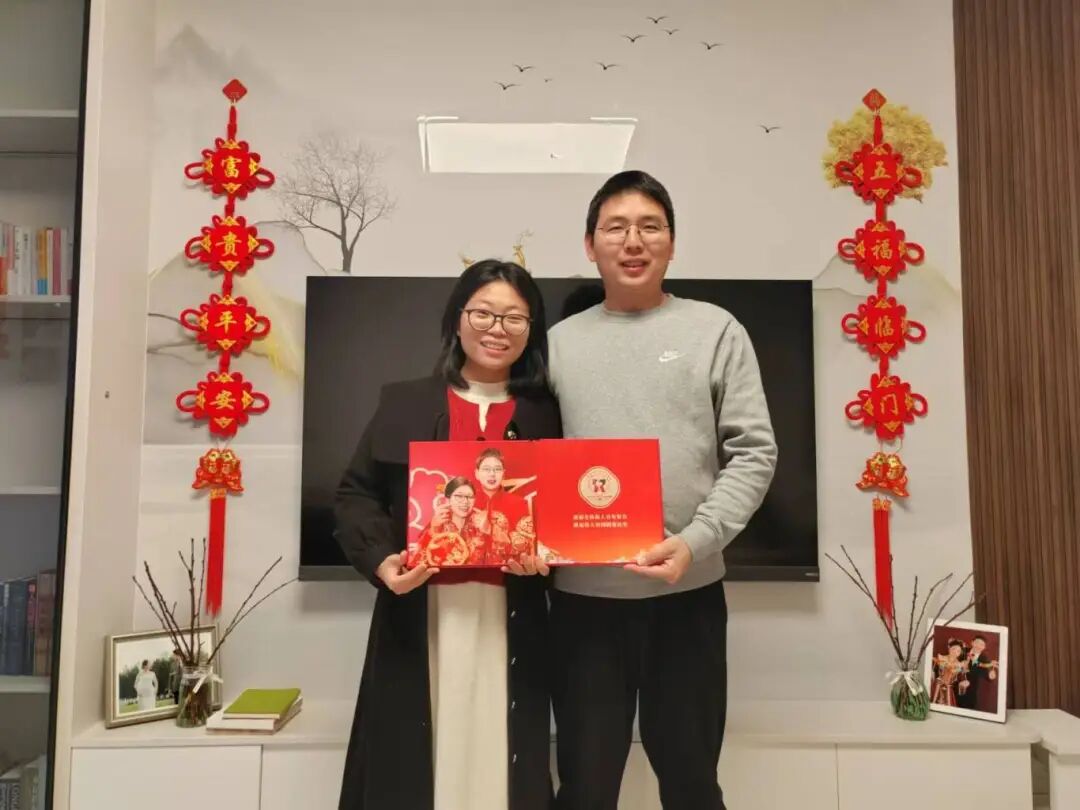 河北省石家庄市的李健鹏收到包装精美的相册,本想让爱人韩丽娟亲自拆封,奈何自己太想看了,就忍不住先睹为快了。晚上,又和爱人坐在沙发上,一起翻看,“太开心了!‘娘家人’细心、周到,还送了一个镶着镜框的福字,这新婚礼物太有爱了!”韩丽娟激动地说。
