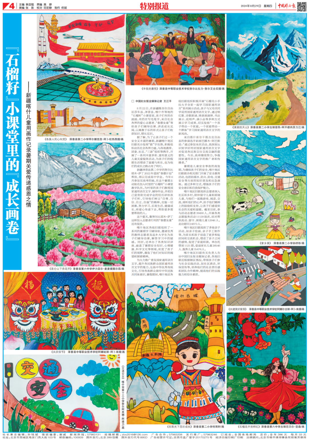新疆泽普县第二中学的努尔比耶木·萨丁2022年受到“春蕾计划”帮扶,得以完成高中学业。今年6月参加完高考的她,在这个暑期主动报名加入村里的“石榴籽”小课堂教学队伍,为村里的孩子们教授国家通用语言文字、辅导作业,并把自己受资助完成学业的经历讲给孩子们听,引导他们树立“自尊、自信、自立、自强”的精神,克服一切困难,努力学习、乐观生活、健康成长,将爱心传递下去,帮助更多需要帮助的人。这个夏天,像努尔比耶木·萨丁这样加入志愿者行列的“春蕾女童”还有很多。喀什地区各级妇联组织了一系列的暑期学习辅导班,邀请优秀的教师志愿者及返乡大学生为孩子们辅导功课,解答学习中的疑惑。同时,还举办了各类知识讲座,涵盖了暑期安全知识、心理健康、科学文化等领域,拓宽了孩子们的视野,激发了他们对知识的渴望和探索精神。为大力推广普及国家通用语言文字,提升各民族群众国家通用语言文字的能力,弘扬中华优秀传统文化,引导各族群众铸牢中华民族共同体意识,暑假期间,喀什地区各级妇联组织积极开展“石榴花小手拉大手全家一起学习国家通用语言”系列展示活动,孩子与父母共同学说用国家通用语言文字,通过唱红歌、诗歌朗诵、情景剧演绎、书法展示、说相声、演小品等多种方式展示学习成果,切实发扬“一个孩子带动一个家庭,一个家庭带动一个群体”学习国家通用语言文字的新风尚。来自塔什库尔干塔吉克自治县的参演选手姑丽巴娜木·阿巴斯说:“通过参加本次活动,我深刻认识到学好用好国家通用语言文字对促进各民族交往交流交融的重要性。今后,我将继续努力,争做国家通用语言文字的推广者和传播者。”暑期是儿童安全事故的高发期,为确保孩子们的安全,喀什地区妇联联合相关部门开展了安全教育活动,包括防溺水、防火、防电、交通安全等方面的知识普及和应急演练。通过多种方式,增强孩子们的安全意识和自我保护能力。喀什地区妇联组织志愿者深入社区和乡村,陪伴留守儿童和困境儿童,与他们一起做游戏、阅读、交流,倾听他们的心声,给予他们精神上的鼓励和支持,让孩子们感受到社会的关爱和温暖。截至目前,参与活动志愿者39490人,开展各类志愿服务活动11139场次,结对帮扶流动、留守、困境儿童12946人,走访慰问24873人。喀什地区妇联组织了多场亲子活动,如亲子绘画、亲子手工制作等,为家长和孩子创造了更多相处时间和交流机会,增进了亲子之间的感情,促进了家庭和谐。举办托管班1121期,受益家长儿童26546人、服务儿童15474人。喀什地区妇联有关负责人告诉中国妇女报全媒体记者,各地妇联还根据辖区情况,带领孩子们参与社会实践活动,如社区清洁、环保宣传等,培养他们的社会责任感和团队合作精神,提高他们的实践能力和综合素质。