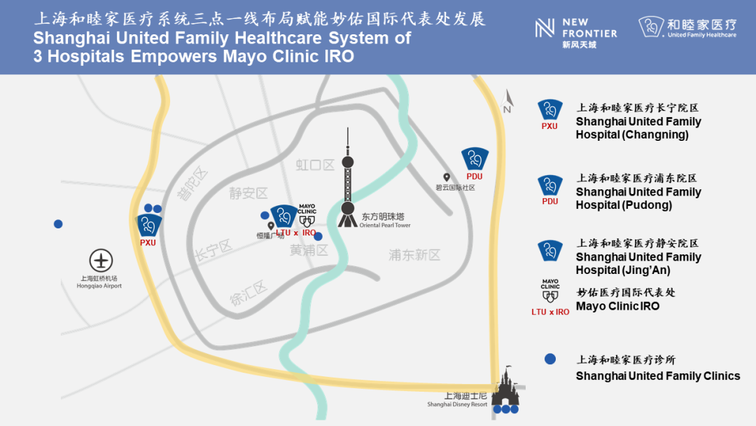 2024年6月22日,妙佑医疗国际(Mayo Clinic) 正式宣布中国首个妙佑医疗国际代表处落址和睦家上海院区内。同时,新风天域也宣布启动国际医疗服务中心,为国内外患者提供一体化就诊服务。