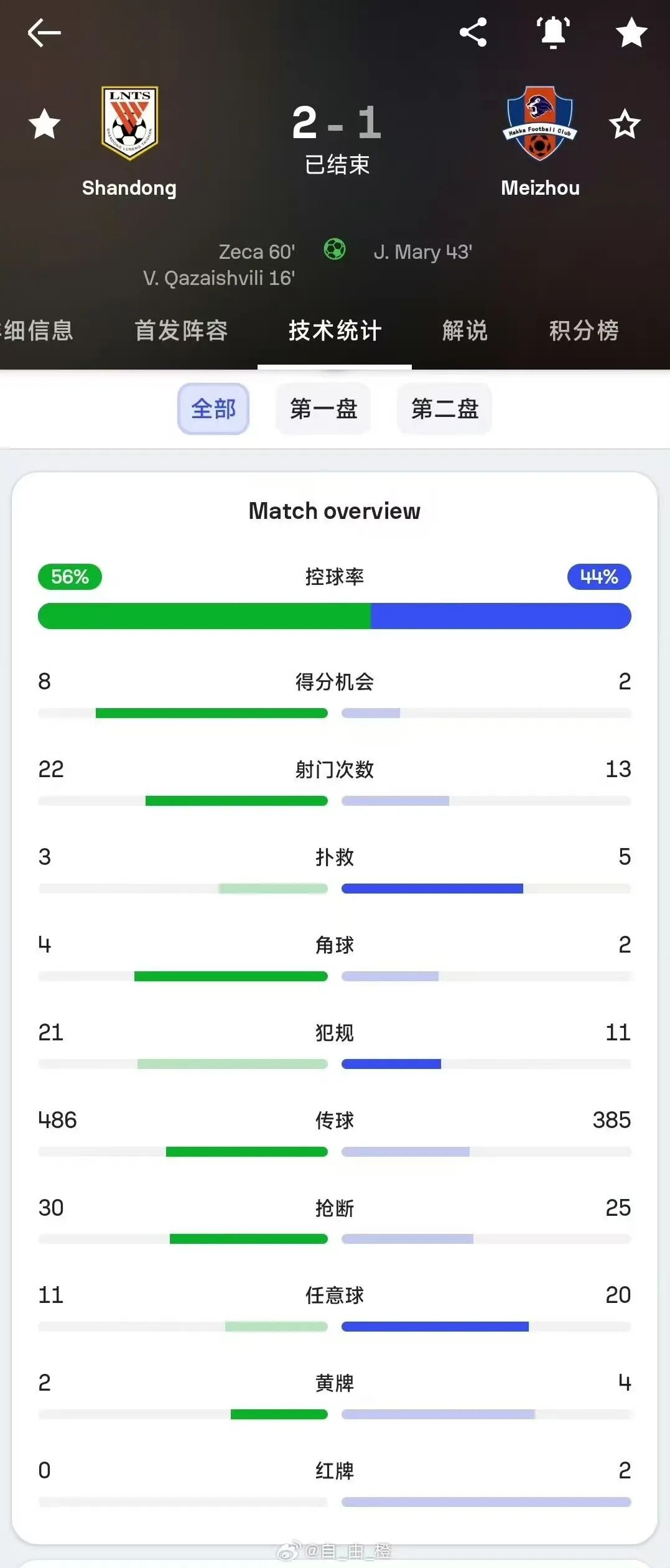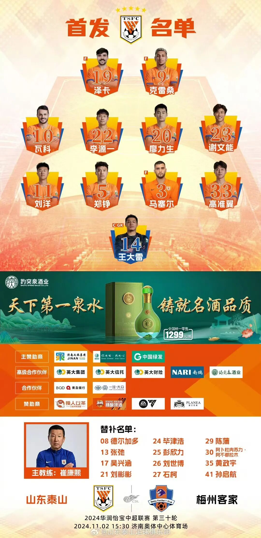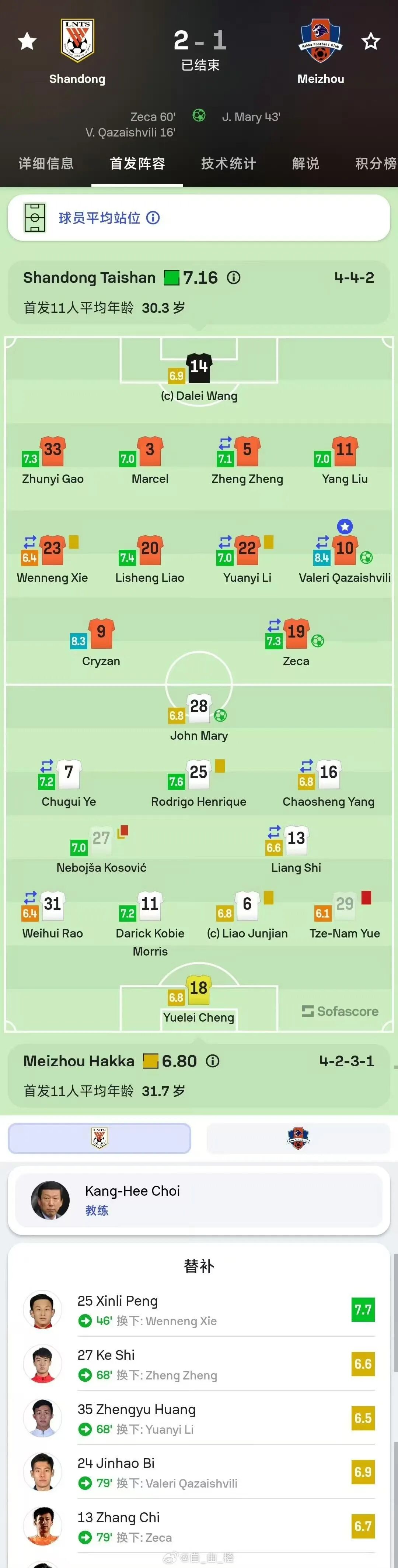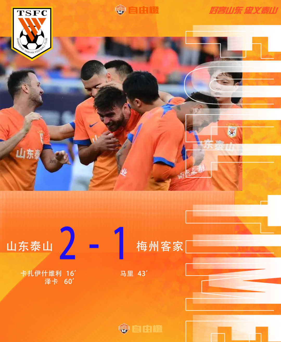 全场比赛结束,泰山队2-1梅州客家,梅州客家遗憾降级。最终泰山队以13胜9平8负、积48分的战绩,位列2024赛季中超联赛第5位。