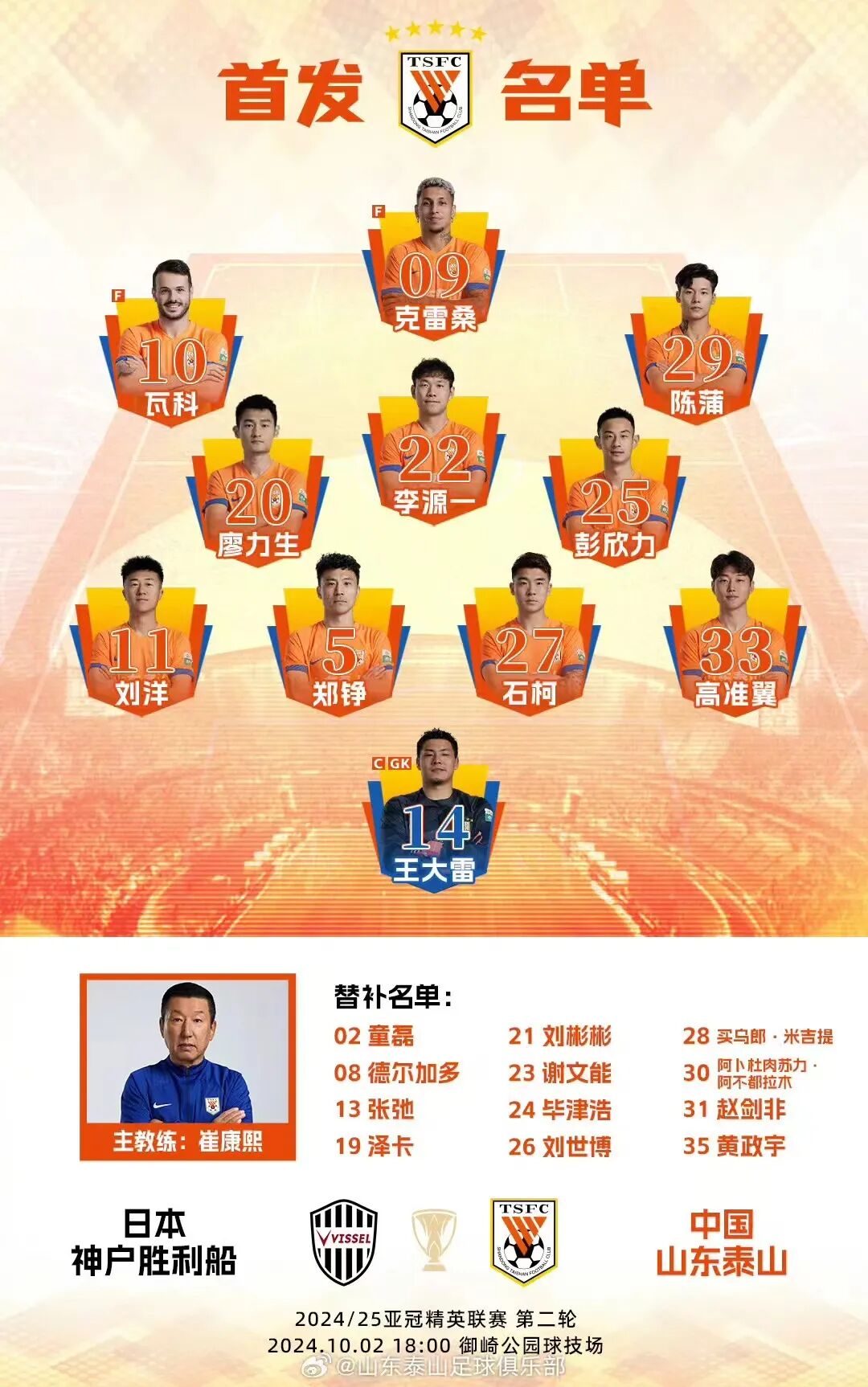 北京时间10月2日18点,亚冠精英联赛第二轮,泰山队客场对阵神户胜利船 。第15分钟,宫代大圣头球破门。第28分钟,克雷桑头球破门,泰山队扳平比分。第51分钟,酒井高德远射,皮球折射后破门。补时阶段,高准翼飞铲后双方爆发大规模冲突,裁判一度示意补时时间再加五分钟,而再次开球后,裁判直接吹了终场哨。最终全场比赛结束,泰山队客场1-2神户胜利船。