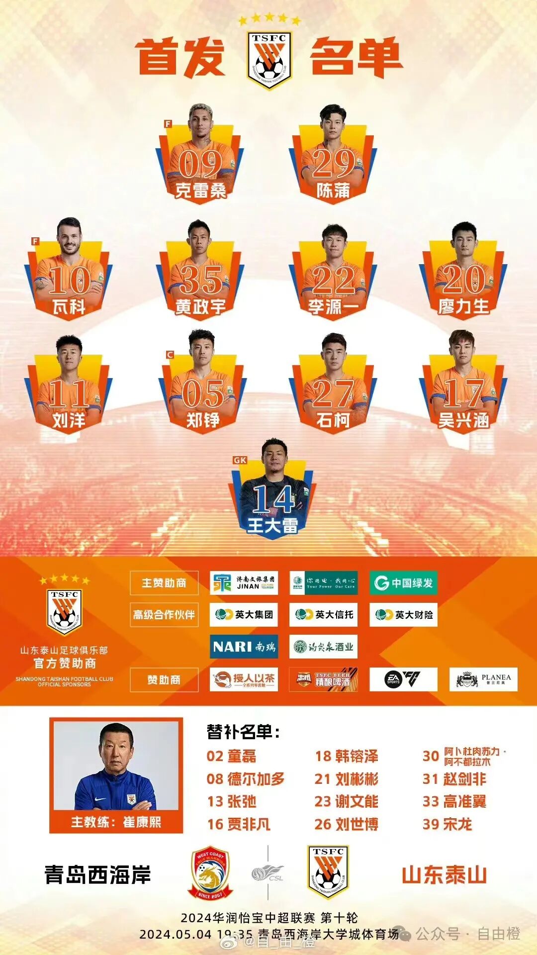 北京时间5月4日19点35分,中超联赛第10轮泰山队客场对战青岛西海岸。第24分钟,克雷桑突破至禁区,一脚劲射打门,皮球被立柱弹出,第46分钟,李源一外围劲射,皮球被季家葆扑出,第70分钟,克雷桑传中造点,后主罚,皮球击中横梁弹出,最终全场比赛结束,青岛西海岸0-0山东泰山。