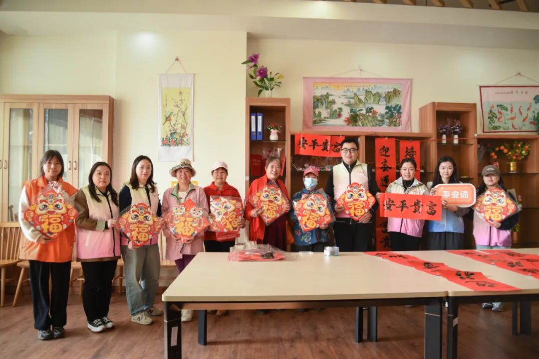 随后,反哺燕团队拿出准备好的福字和现场拓印的祝福语,与老人们一起为养老院的各个角落增添节日氛围。整个养老院在福字和春联的装点下,焕然一新,喜气洋洋。