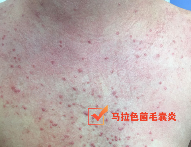 马拉色菌毛囊炎的皮损非常有特点,表现为圆顶毛囊性红色小丘疹,顶端可以出现脓疱,伴有程度不同的瘙痒,运动出汗洗澡可能会加重瘙痒。