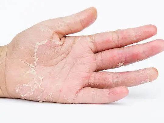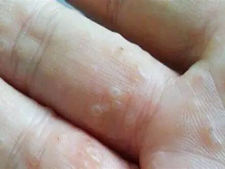 在手掌、指部或侧缘部出现深在性水疱,瘙痒,进而有鳞屑有时呈领圈样,炎症多不明显,但亦可发生糜烂、渗出,有感染时出现脓疱等,有的则表现为干燥鳞屑,伴皲裂而无水疱。