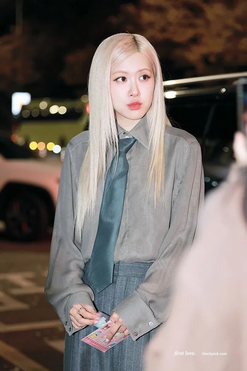 衣品持续在线的Rosé贡献了不少power suit穿搭范本,其中宽大的缎面领带相当加分,既打造出慵懒复古的视感又在颜色上“承上启下”,有种华尔街精英也钟情三丽鸥的反差萌,有趣有看头。