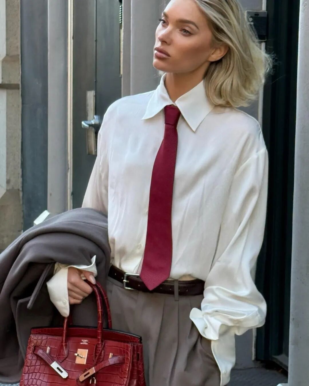 也可以“顺势而为”,像欧阳娜娜这样搭配同样廓形宽大的男友风衬衫,酒红kipper tie不仅让衬衫的质感“支棱”起来,更注入了浓浓的学院氛围,是格兰芬多学姐nabi!