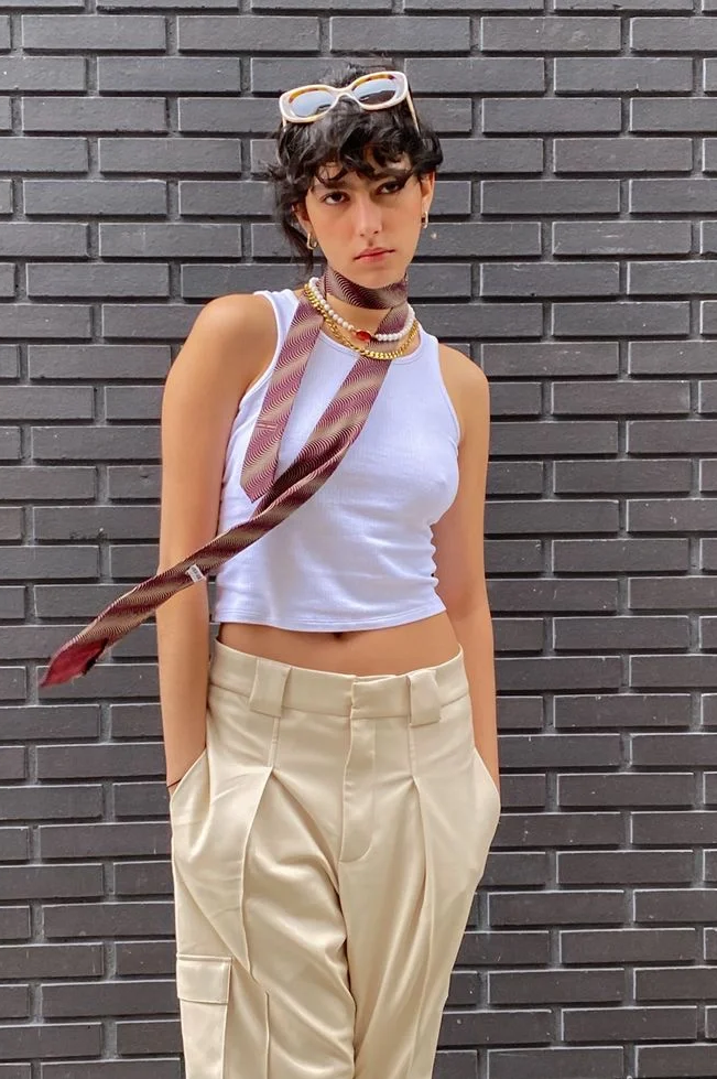 博主Sofia Coelho就常常将领带与谷仓夹克、运动外套这些看似不在一个“次元”的单品等做叠搭,这样故意露出马脚的方式很chill~
