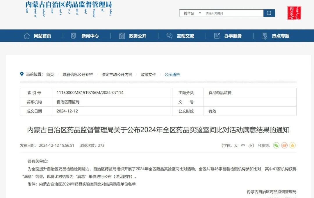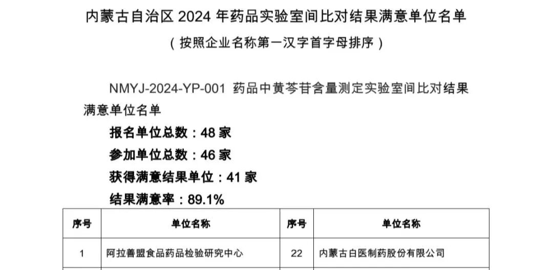 近日,在2024年内蒙古自治区药品实验室比对活动《药品中黄芩苷含量测定》中,联邦制药(内蒙古)有限公司质检部传来喜讯,其检测获得了最高评定“满意”的结果。