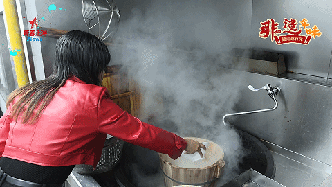 宽敞的后厨厨房里,点心师傅们正忙碌不停。一个用来蒸饭的大木桶摆在锅炉旁,尤其显眼。做八宝饭要用的关键材料糯米,就摆在木桶边。见状,徐佳探出头去,好奇地打量。点心部部长姚建华熟稔地从饭桶里舀起糯米,均匀撒进木桶中:“这些糯米在这之前已经浸泡八小时。用木桶蒸米,糯米会更有香味,也会更有弹性。”
