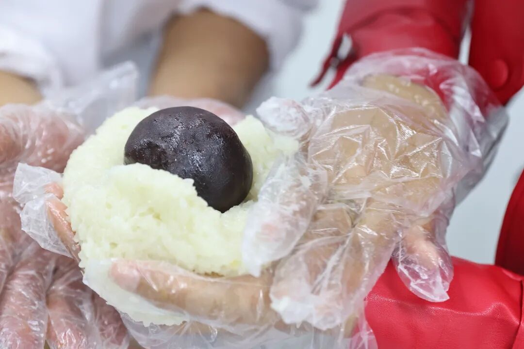 挖下糯米,品尝豆沙