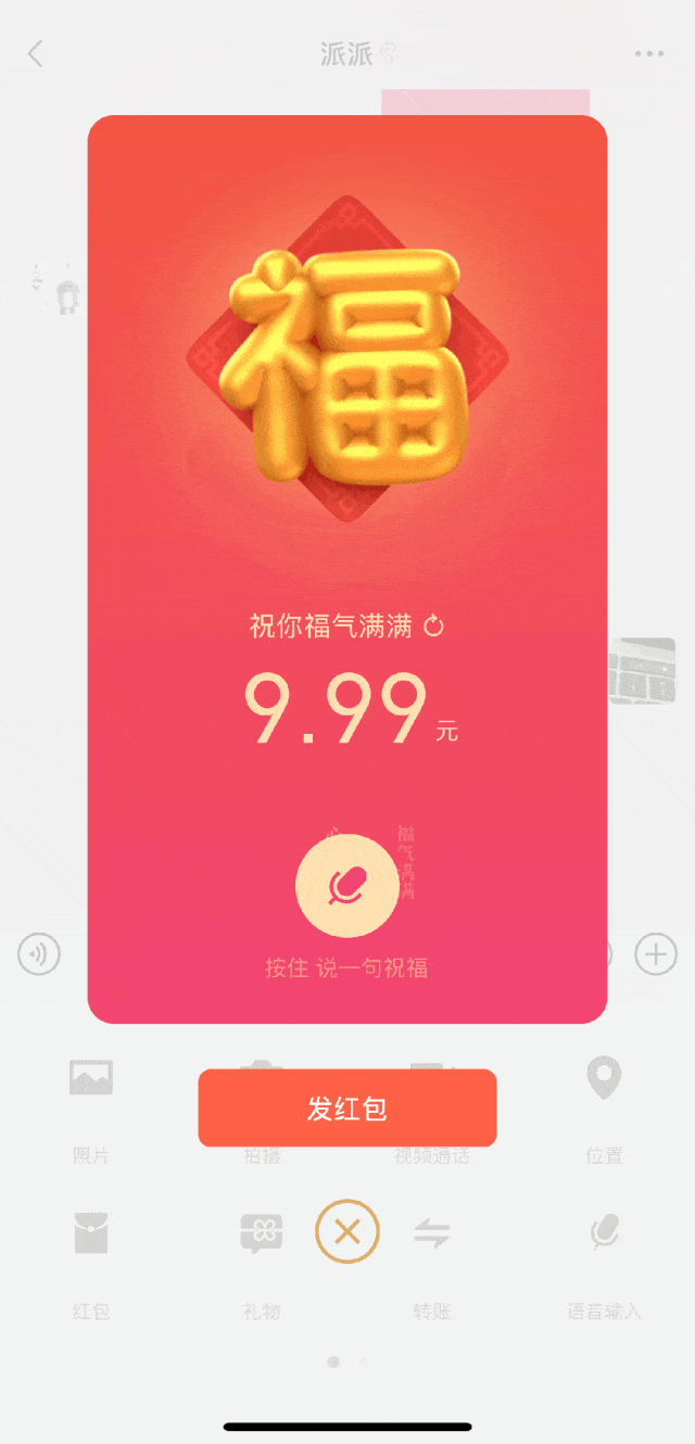 长按红包上的语音按钮,就可以把你的祝福亲口说出来,一起发送。