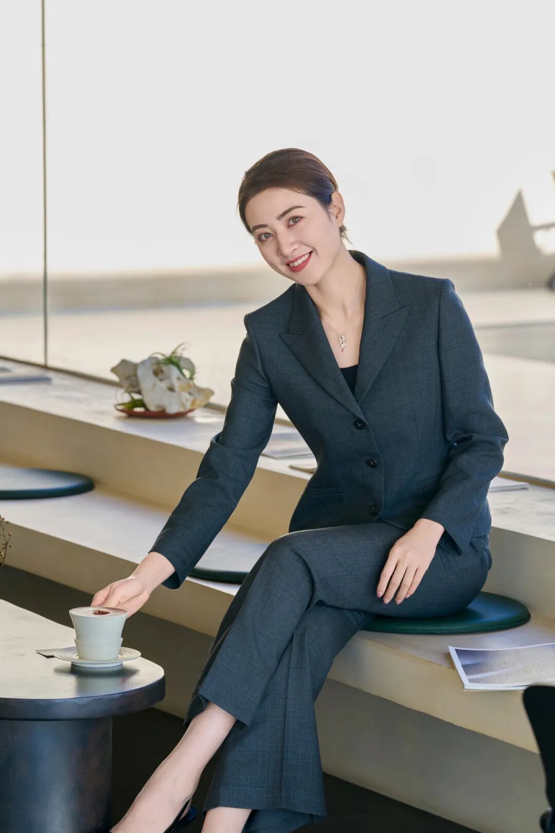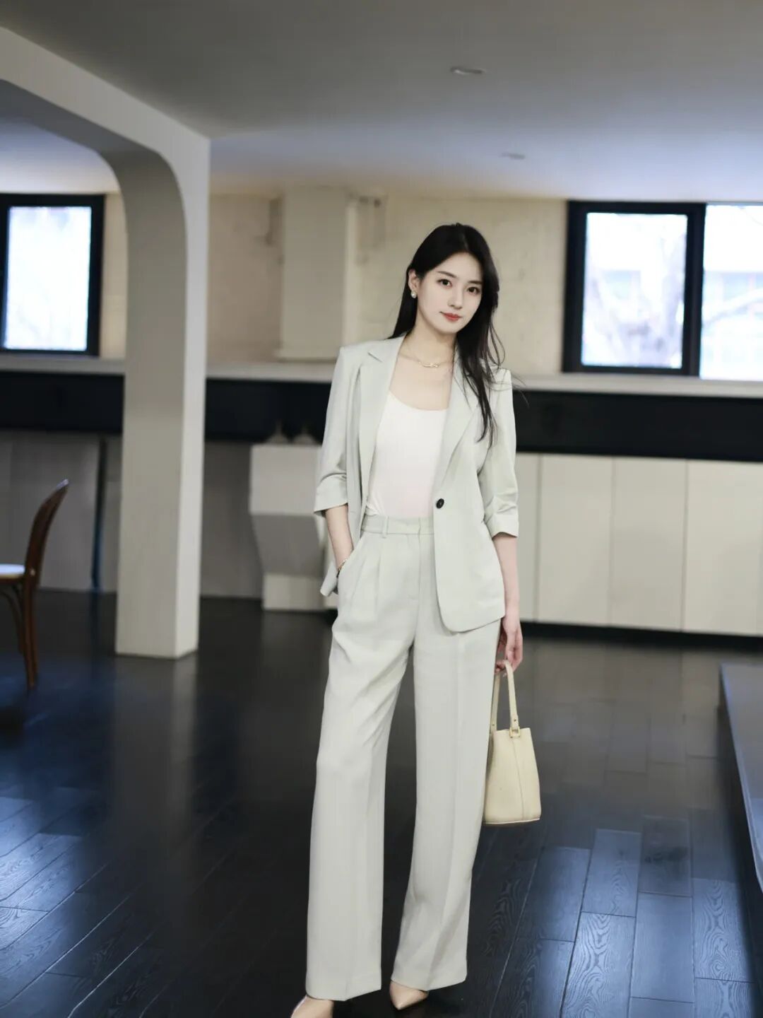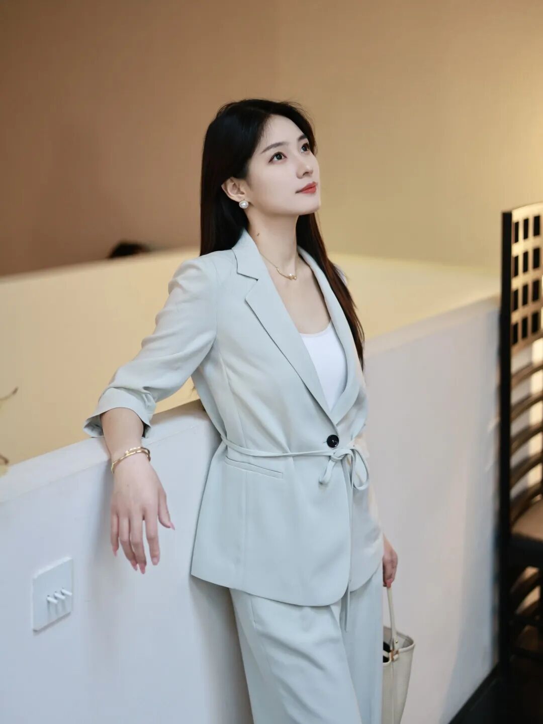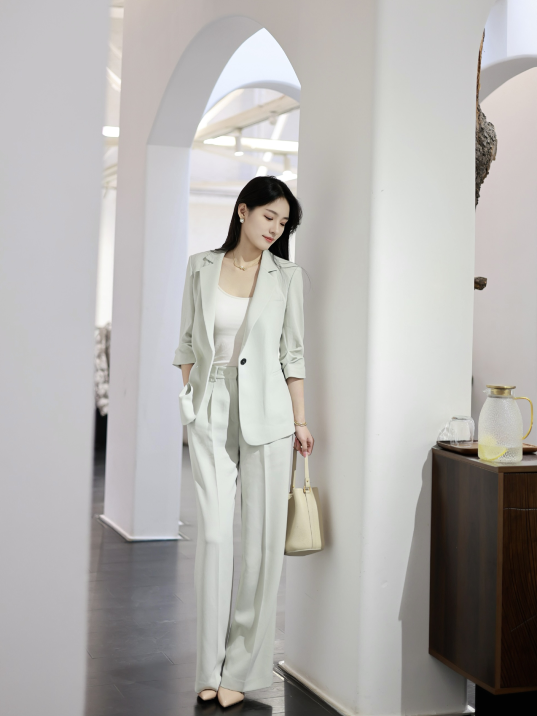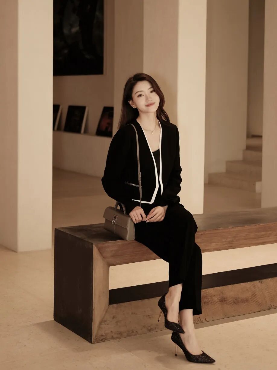 游刃于创作灵感与商业运作的相处之道,她更偏爱于着装中放入艺术思考。汲取国风文化色调,为简适自然的穿衣法则注入传统经典。以轻盈湖绿色消解西服套装的刻板印象,让艺术能量场加持创意灵感,以自适的状态与藏品对话,为审美赋以新意。