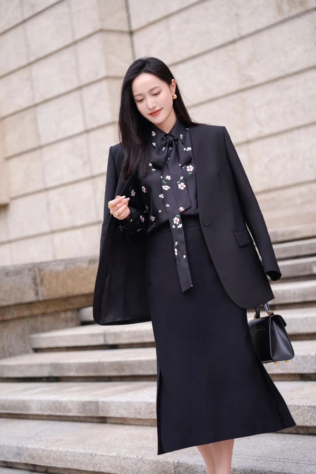 每日跟内容、创意打交道,促生了她不同于常规,凡事“多加一点”的习惯。不用局限于特定场域的职场风格,用“浪漫”点缀,在舒适简约的廓形之中嵌入小面积印花、飘带,为素色风格加入更多生机与新鲜感,是她打造通勤日常风格的思路典范。