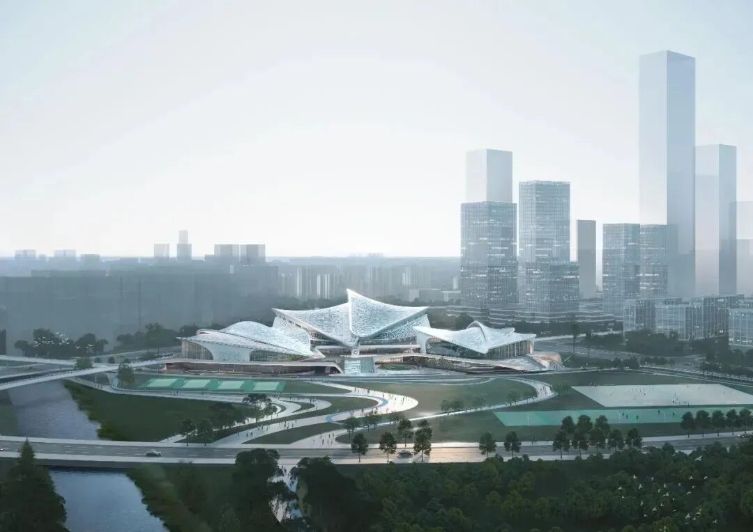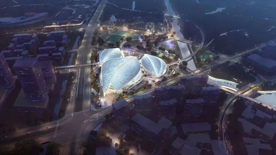 据了解,南上海体育中心项目是奉贤新城CAZ望园森林芯首发项目,北侧有4.3平方公里的中央公园,东南方向则是赫赫有名的上海之鱼,处在新城两大生态核心区域之间。项目总投资约18亿元,建筑设计理念以“海上玉兰”为寓意,提取“花瓣”的平面作为主要构成元素,使建筑整体呈现三朵玉兰交相辉映的格局。三大主题场馆既可实现独立运营,又能在功能之间实现整合互动,也能最大限度保留林地和水系的原真性。
