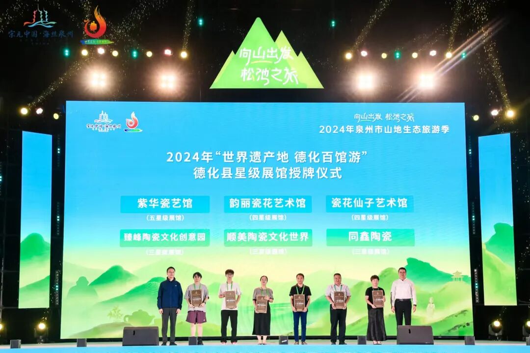 近年来,德化全力打造“一城瓷器百馆游”陶瓷文化精品,通过评定星级展馆以夯实陶瓷文化旅游内容。仪式上,泉州市文化广电和旅游局党组成员、三级调研员周梁升、德化县人民政府副县长洪仰行授予连紫华瓷艺馆五星级展馆,韵丽瓷花艺术馆、瓷花仙子艺术馆四星级展馆,臻峰陶瓷文化创意园、顺美陶瓷文化世界、同鑫陶瓷三星级展馆称号,望其为推动德化文旅经济发展贡献力量。