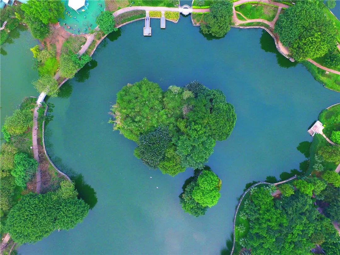 公园内的湖心岛上鹭鸟翔集
