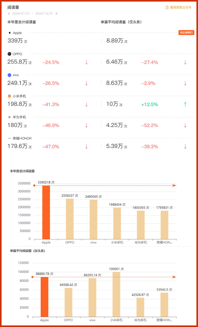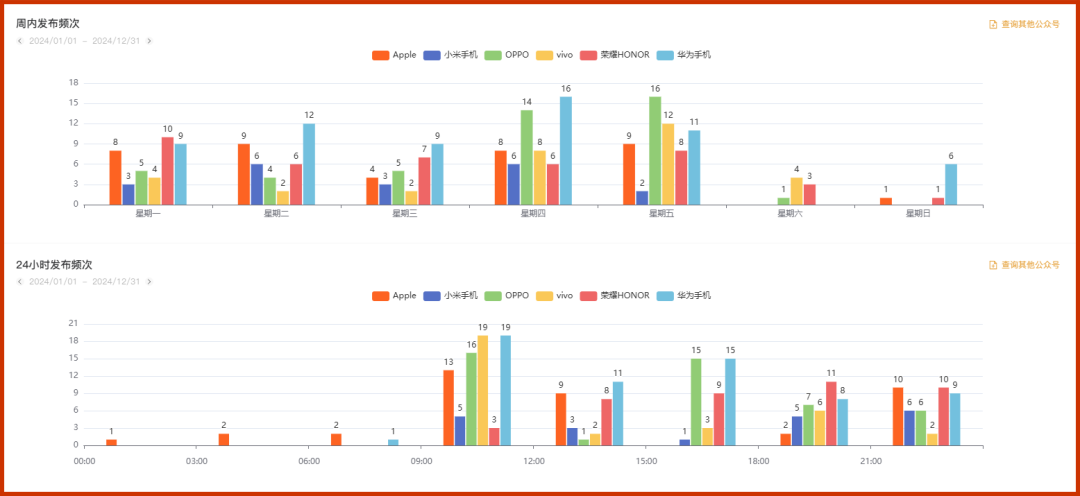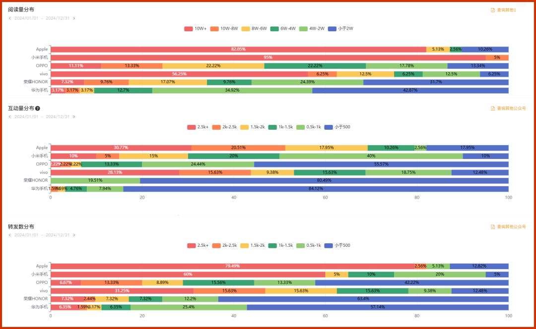 从周内发布频次来看,所有账号时间都较为分散,这应该和手机新品发布、福利活动的开启时间无法固定周几有关。从24小时发布频次来看,vivo最为固定,基本都是在9点到12点之间推送,偶有其他时间发布,其他账号则相对分散。受篇幅限制,这里只跟大家展示一下每个账号的2024阅读量TOP3文章,在小幂书中可查看阅读量、转发数、点赞数、留言数等多个维度的TOP20文章。手机账号的TOP文章,上榜类型主要为新品发布、品牌联名和促销福利活动3种。我们在策划类似主题的图文时,值得好好参考学习一下。除以上数据外,小幂书(misum.cn)生成的月报还包含月增长率、月度TOP20文章,以及仅头条和非头条的各种相关数据,包括阅读量、互动量等多个维度的总计数、平均数、中位数和最高数等,并附有对应的柱状图/折线图,让数据情况一目了然。最新上线的插件授权版还有粉丝、阅读率、完读率之类的数据。