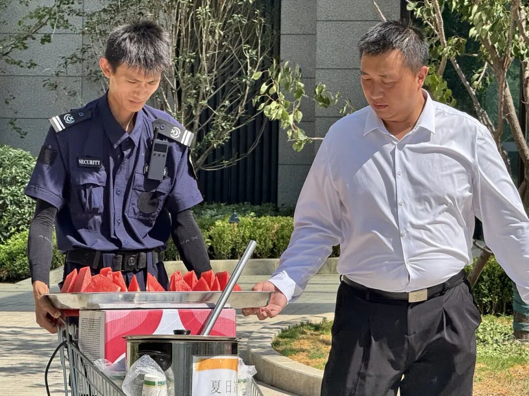 面对高温天气,绿城发展服务各项目也已备好防暑药品,防暑物资,开展防暑应急演练保护每一位工作人员的安全,同时开展送清凉活动,一份冷饮、一块西瓜,为业主和坚守岗位的同事,吹散一天的积郁的热气。