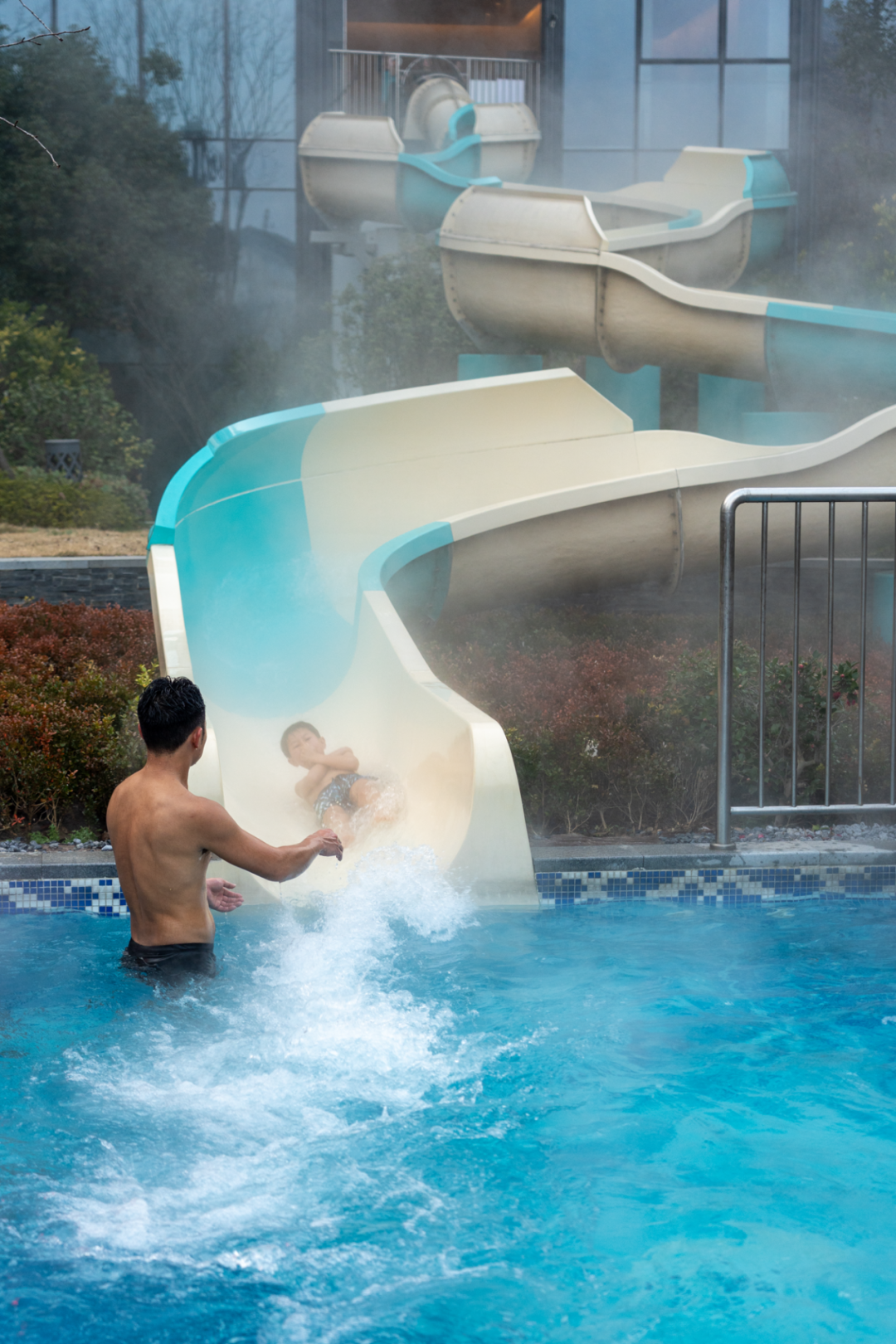 带娃从云端滑道一秒入池