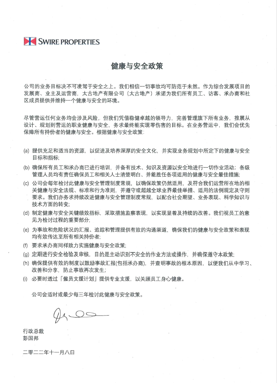 公司全面承诺在所有业务中消除或减轻健康和安全的危害,而且提出了我们务求最终实现零伤害这一具有挑战性的目标。太古地产以该政策为指引,在旗下所有业务从规划、设计到运营推行完善的职安健管理。