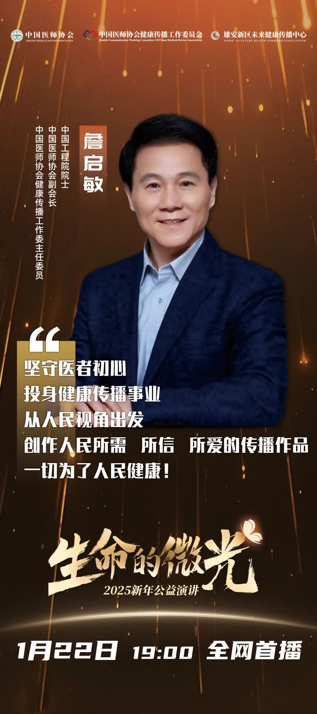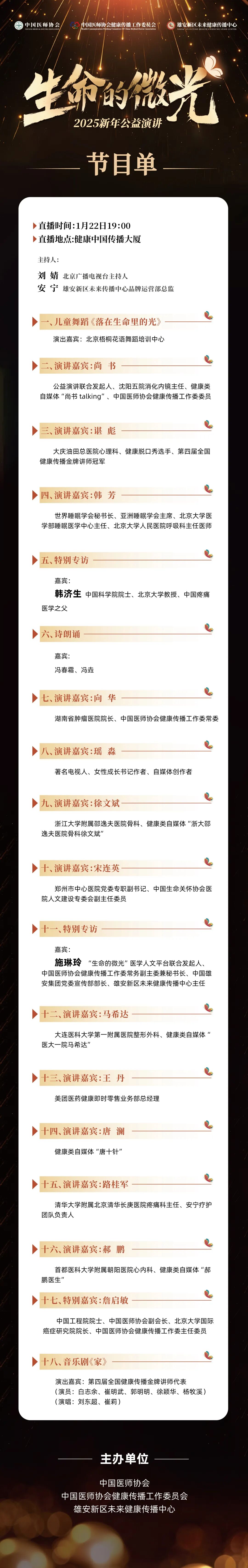 “大年夜看春晚,小年夜看微光”,《生命的微光》新年公益演讲走过四届,已成为医学人文类现象级项目,为国人带来温暖与力量。演讲嘉宾涵盖院士、世界冠军、医者、主持人等不同领域的业界代表,他们分享生活中坚守与奋进的故事,展现生命的顽强与坚韧,传递生命蕴含的磅礴希望 。