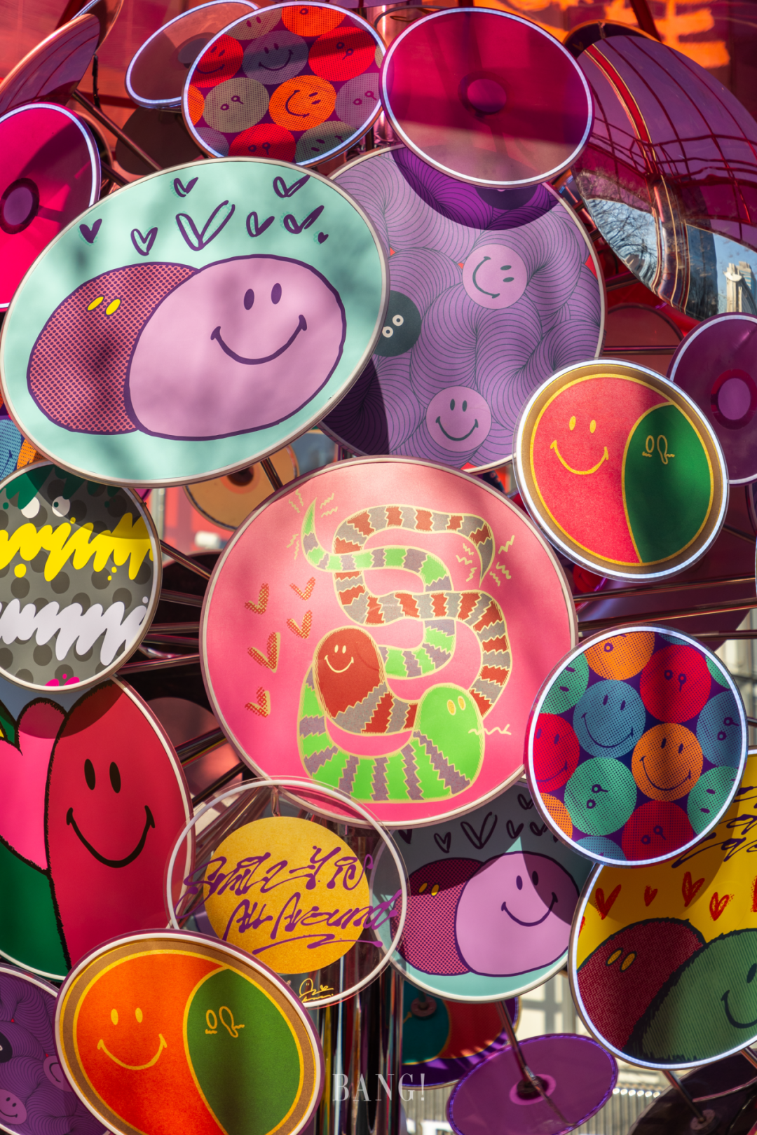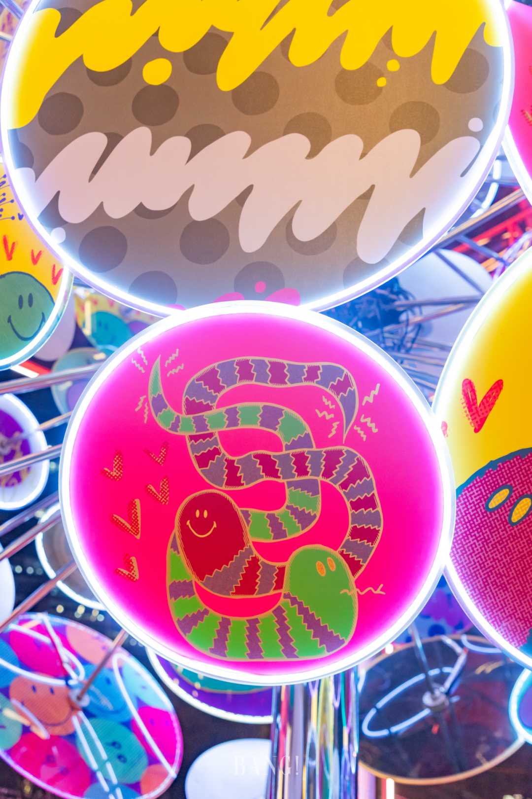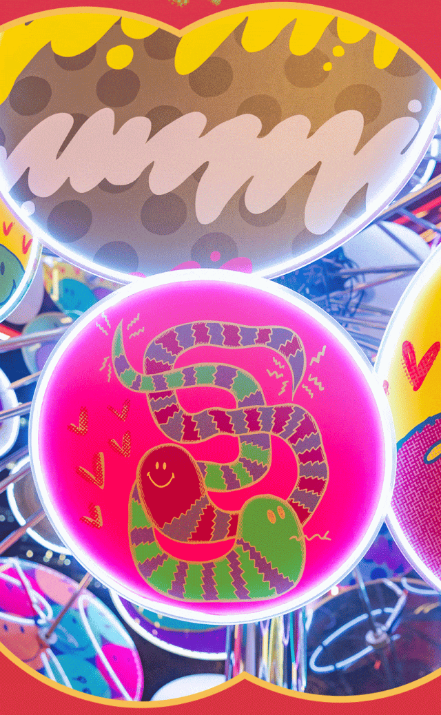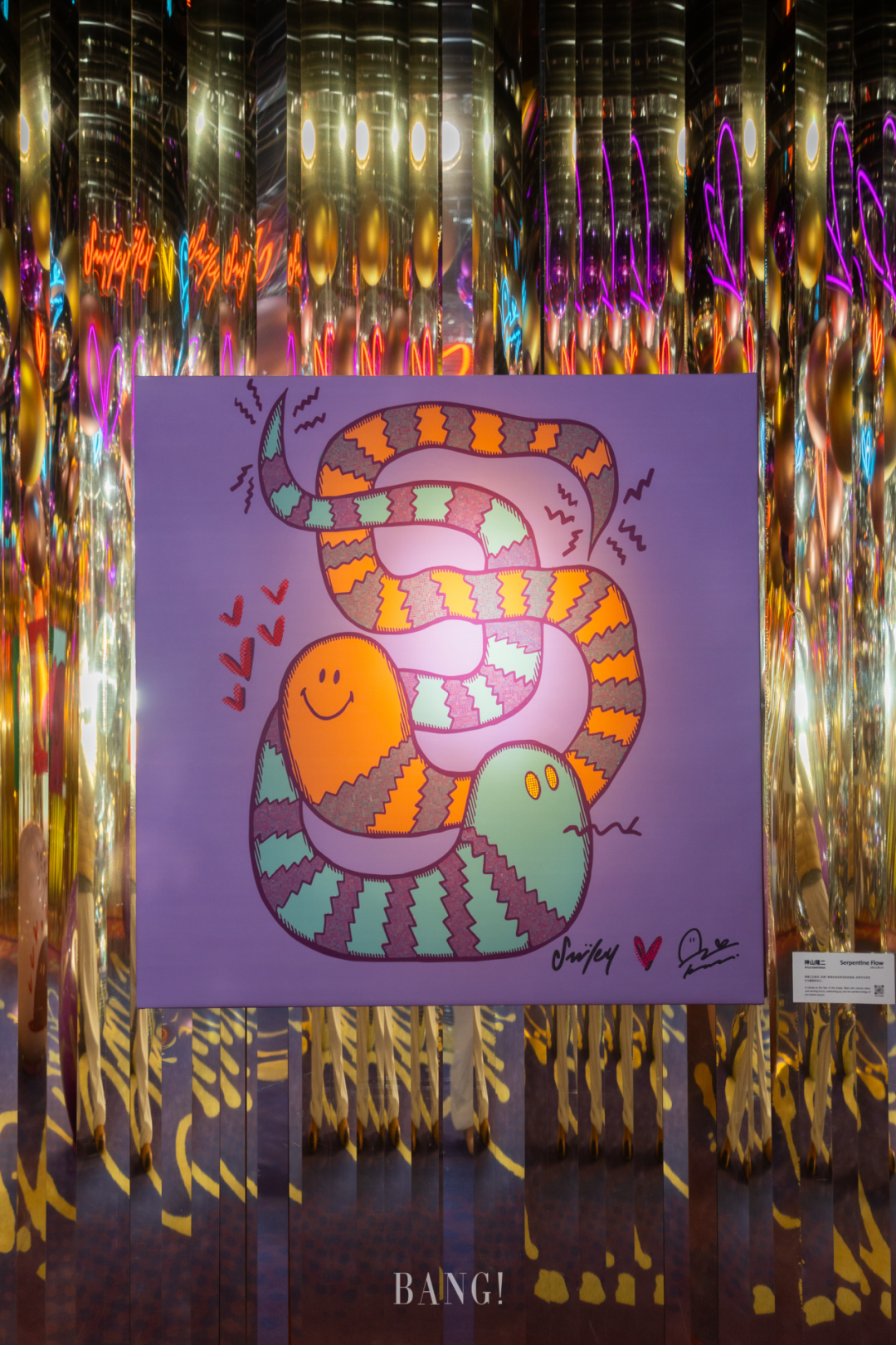 其中B姐最喜欢的就是“蛇遂如意”,艺术家以绚烂的色彩为笔,以飘逸的线条为墨,巧妙地将RatFace与SMILEY元素融合碰撞,勾勒出两条宛如灵蛇般蜿蜒灵动、充满活力的图案。