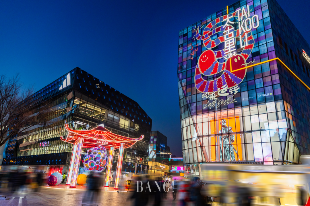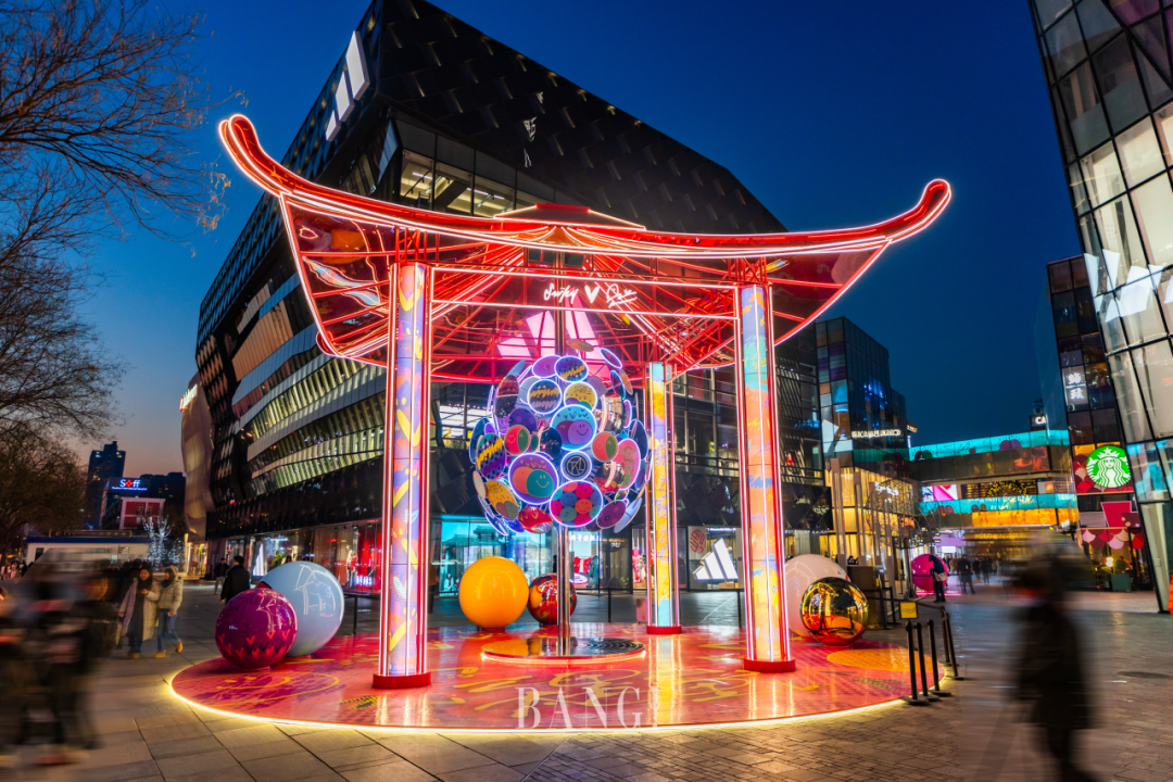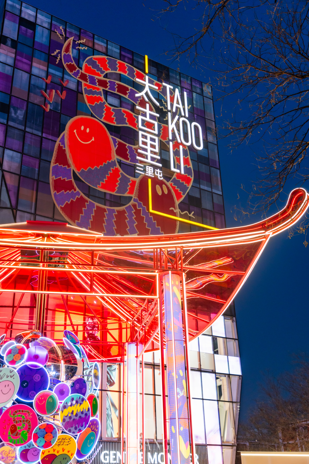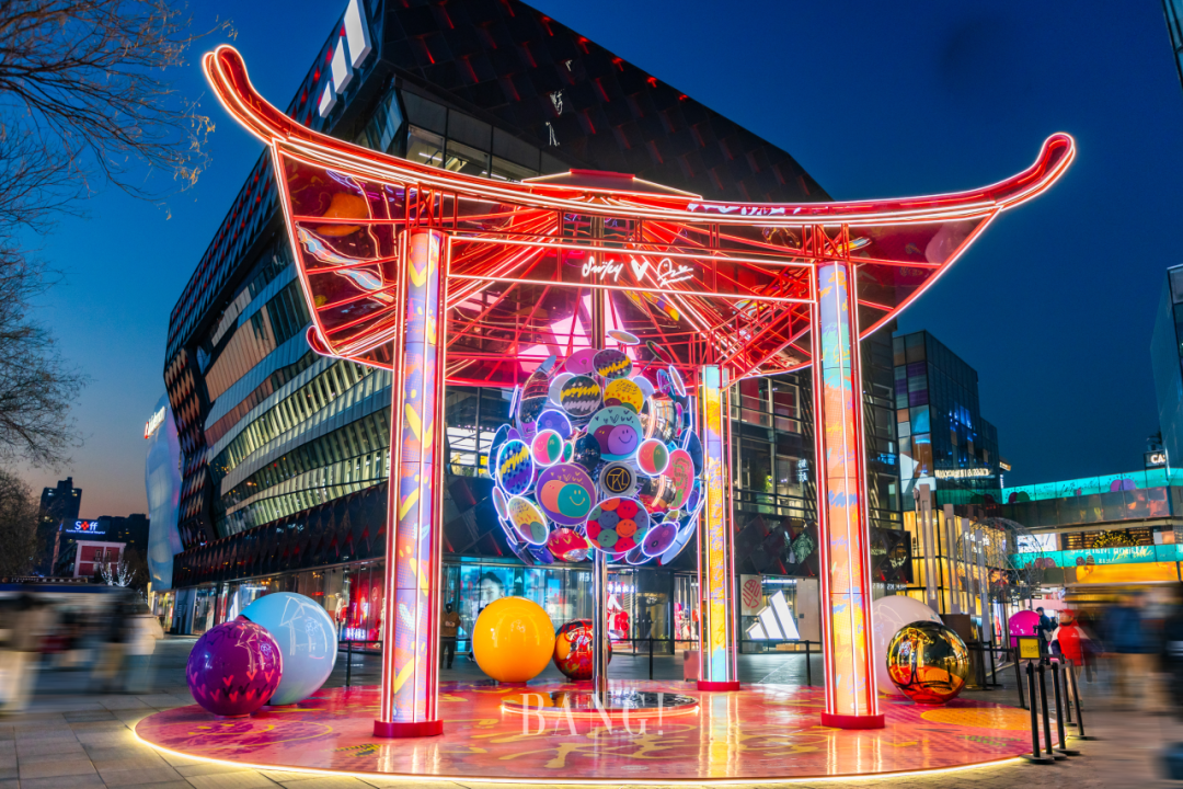 刚踏入三里屯太古里南区,一眼便能望见令人瞩目的 “瑞彩福庭” 装置。飞檐斗拱的精巧构造展现着传统建筑的曲线美,恰似灵蛇游走般轻盈流畅,将中式建筑的独特韵味演绎得活灵活现。