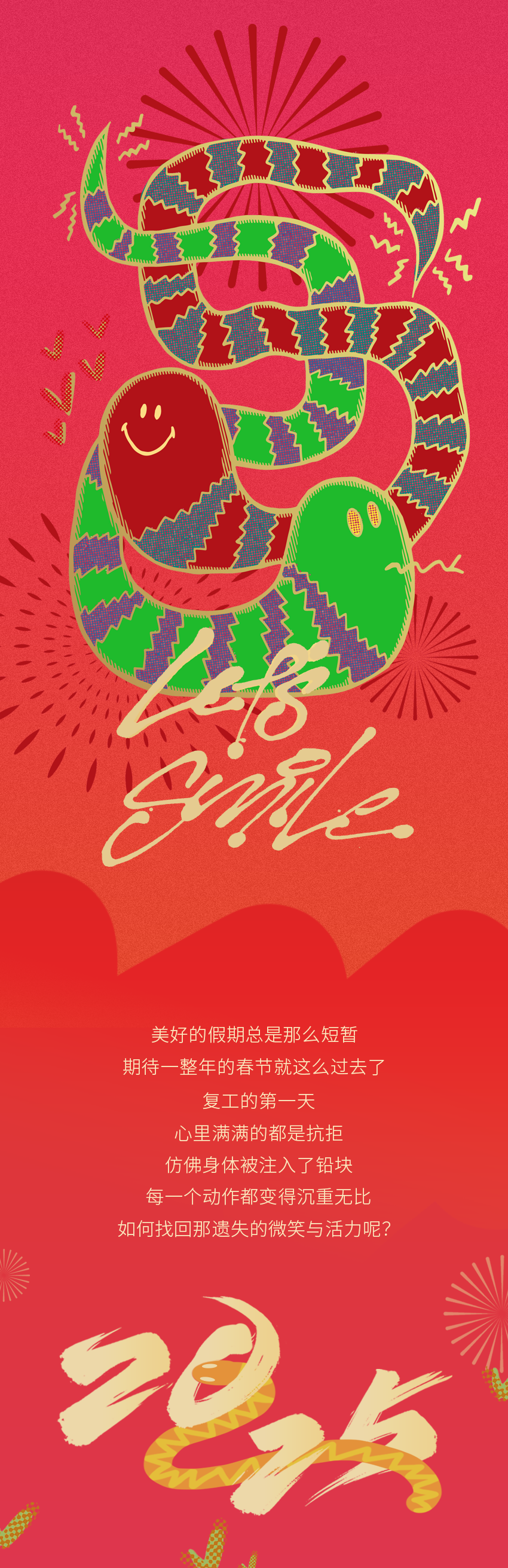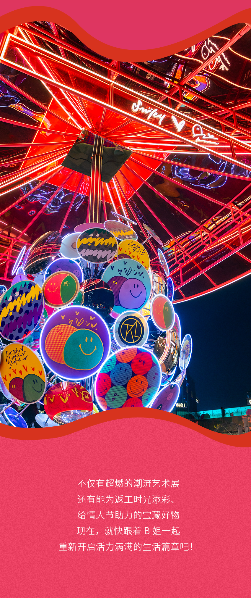穿过潮流时尚的街区走至北区,以红色为主色调的“微笑艺廊”年味满满,四周悬挂的新春灯牌,闪烁着温暖的光芒,为这喜庆的场景增添了几分灵动与温馨。