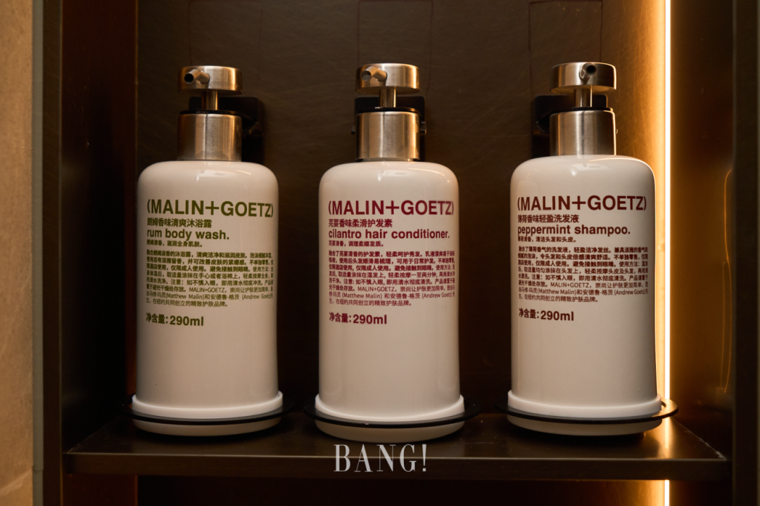 值得一提的是,所有酒店客房均选用美国小众护肤品牌“MALIN+GOETZ”洗护,结束一天的旅程,让芳香浸润全身,伴着独特香气入眠。