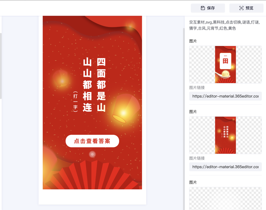操作也很简单,只需选中素材,点击【svg】编辑器,在工作台自行替换带有谜底答案图(即点击后图片)、点击前图片,工作台有替换图片的建议尺寸。