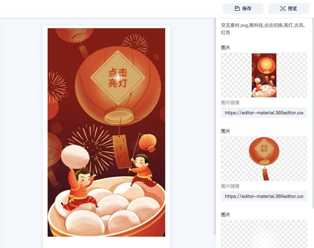 如果想要给粉丝送祝福,同时体现元宵节主题氛围感,就可以使用这款点击切换,亮点的交互素材。