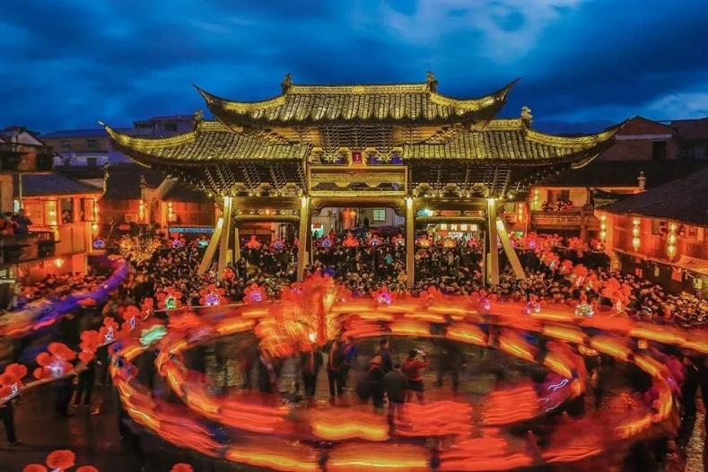 伴着鞭炮、锣鼓声声蜿蜒前行