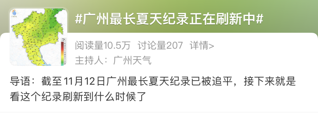 #广州最长夏天纪录正在刷新中#的话题冲上热搜。截至2024年11月12日,广州最长夏天纪录已经被追平,新的纪录还在持续刷新中。