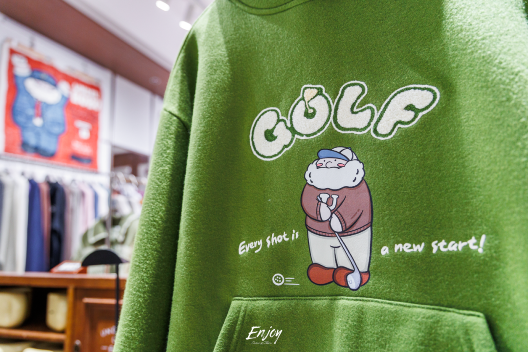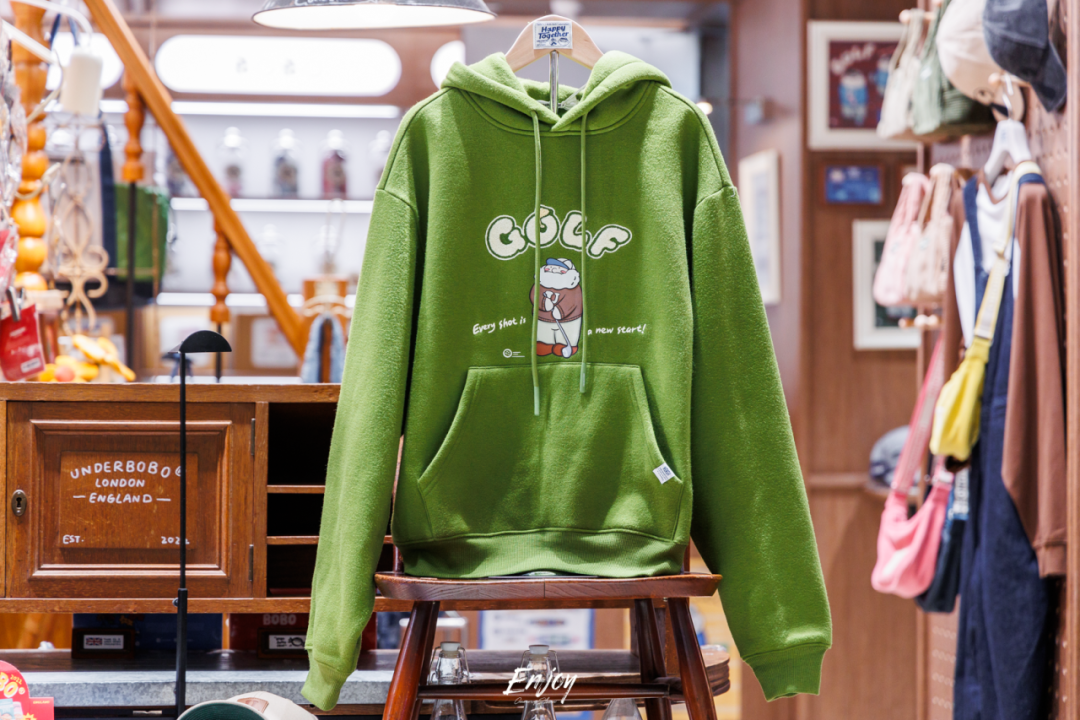 中间层搭配连帽卫衣,无论穿脱都很好看。UNDERBOBO的“高尔夫系列连帽卫衣”,葱郁的绿色搭配可爱的高尔夫球BOBO,凸显自由与休闲的气质。