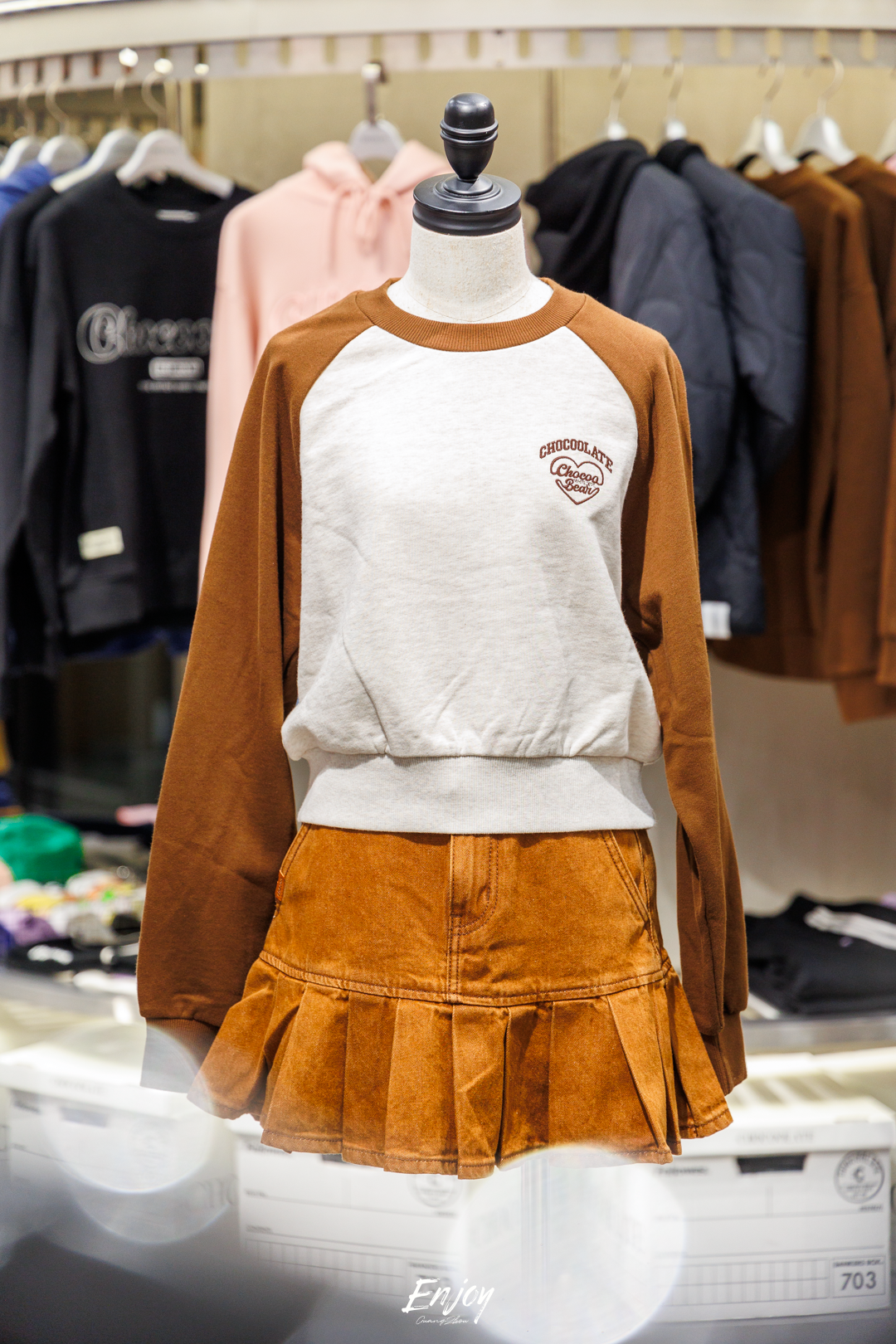 “上身蒸松糕,下身卖凉粉”(意为上身穿长袖,下身穿清凉的裙子或短裤)也是广东冬日里常见的穿搭。简约休闲款式的“女装插肩袖圆领卫衣”搭配复古甜美的“女装半身A字裙”,展现出广东人随性而不失个性的穿衣态度。