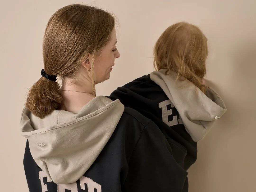 「亲肤磨毛字母贴布卫衣套装(亲子款)」,采用远红外科技面料吸收阳光后持久深度保暖,复古学院风贴布绣字体logo,亲子组合搭配正反拍摄更有趣。
