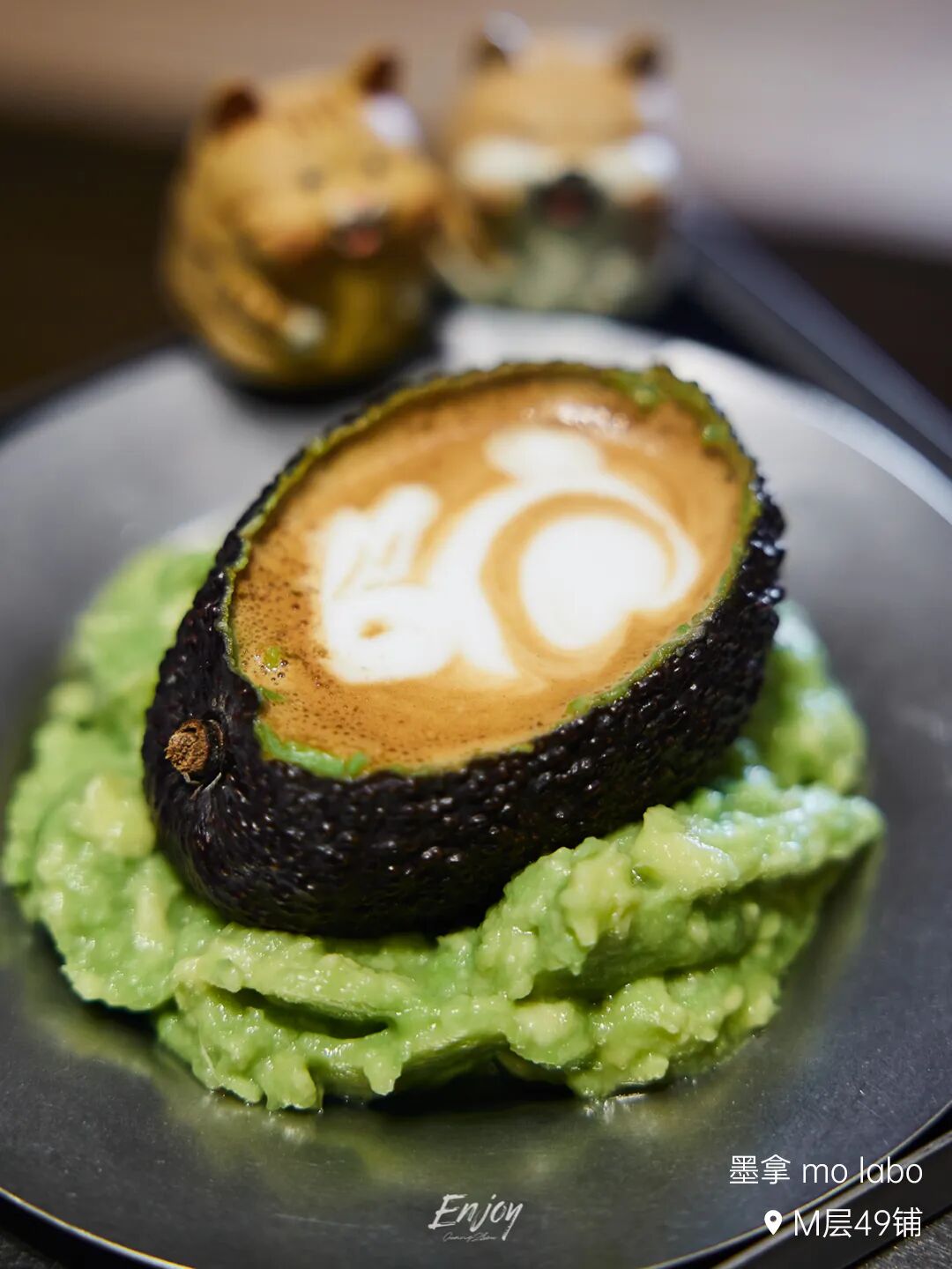 墨拿 mo labo到店特供的「墨墨牛油果拿铁」,原只牛油果果肉挖出制成果酱,果壳作为盛放咖啡的容器,拉出兔子形状的拉花,俏皮感十足。牛油果的清新中和了咖啡的醇香,在味蕾展现多种风味,一次收获双倍快乐。