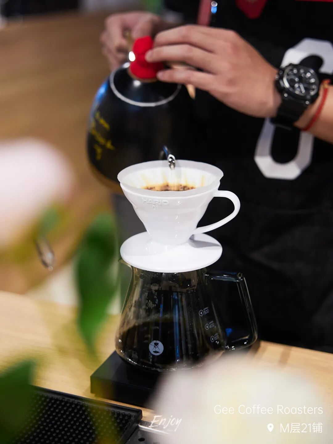 坐在Gee Coffee Roasters吧台前品尝一杯「水洗瑰夏·希望庄园·白兰」,看咖啡豆慢慢被研磨成粉,接过咖啡师手中的咖啡粉,用手轻轻扇动空气,闻到其中淡雅的白色花香,像刚刚绽放的玉兰花;随着咖啡入口,像倏忽吹过的一阵带有花香的微风,还有姜糖细微的甘甜和乌龙茶香,如同柔滑的茶汤如丝绸般在舌尖滑过,高雅、怡人、缱绻。
