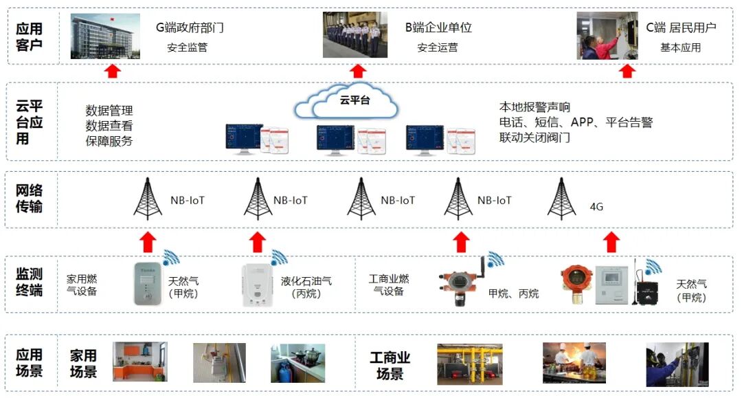 实时监测天然气(甲烷)、液化石油气(丙烷)的泄漏情况,发生警情,设备立即发出报警声响提示周边人员,并联动关闭燃气阀门,防止泄漏进一步发生。同时将报警信息上传至监管平台,以电话/短信/APP形式通知相关负责人,迅速赶往现场处理降低危险事故概率。