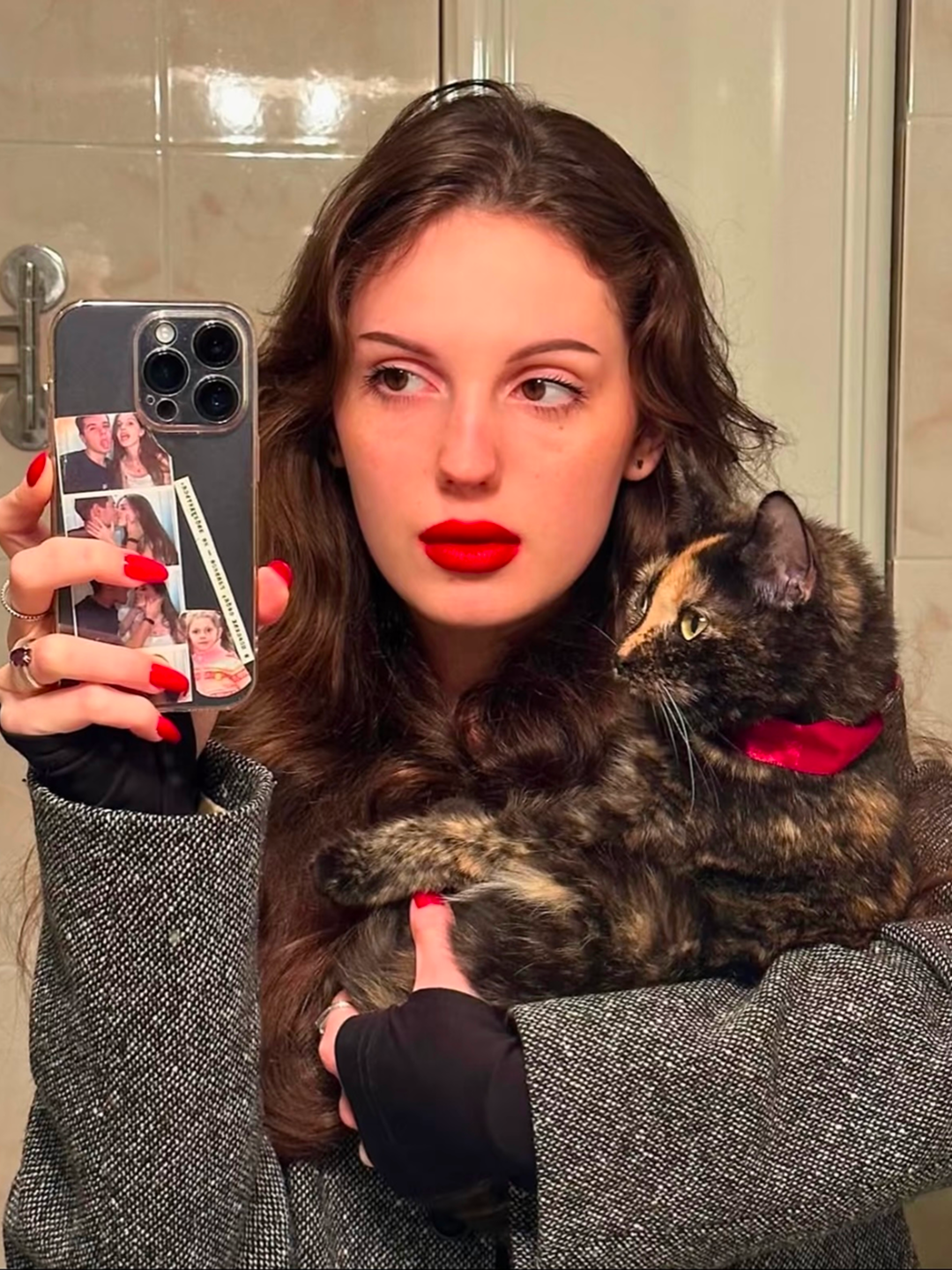 彭小苒的妆容精致且有魅力,以红色系眼妆为亮点,搭配棕红色眼线勾勒出迷人的眼部轮廓,红唇与玻璃唇的结合更是鲜艳夺目,与整体妆容相得益彰。眼下的小装饰点缀,为妆容增添了层次感和复古情调。
