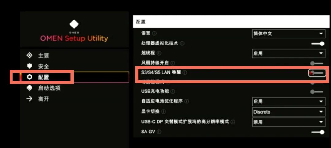 开机快速连续的点击F10,选择【配置】,关闭【S3/S4/S5 LAN唤醒】功能,接着点击F10保存退出,即可回到系统