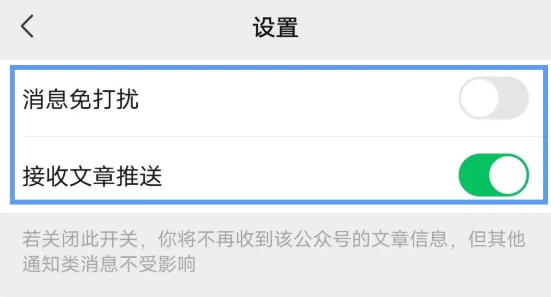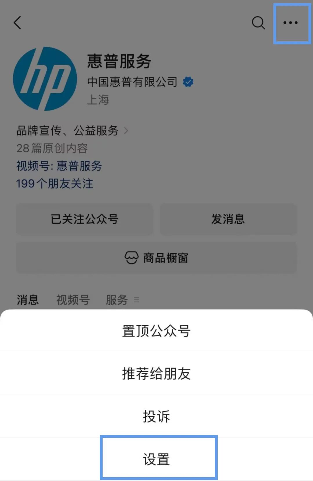 进入惠普服务公众号主页,右上角点击三个点,选择设置,【关闭】消息免打扰,【开启】接收文章推送