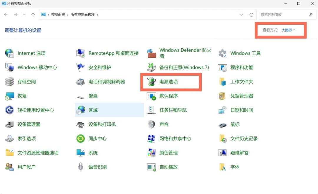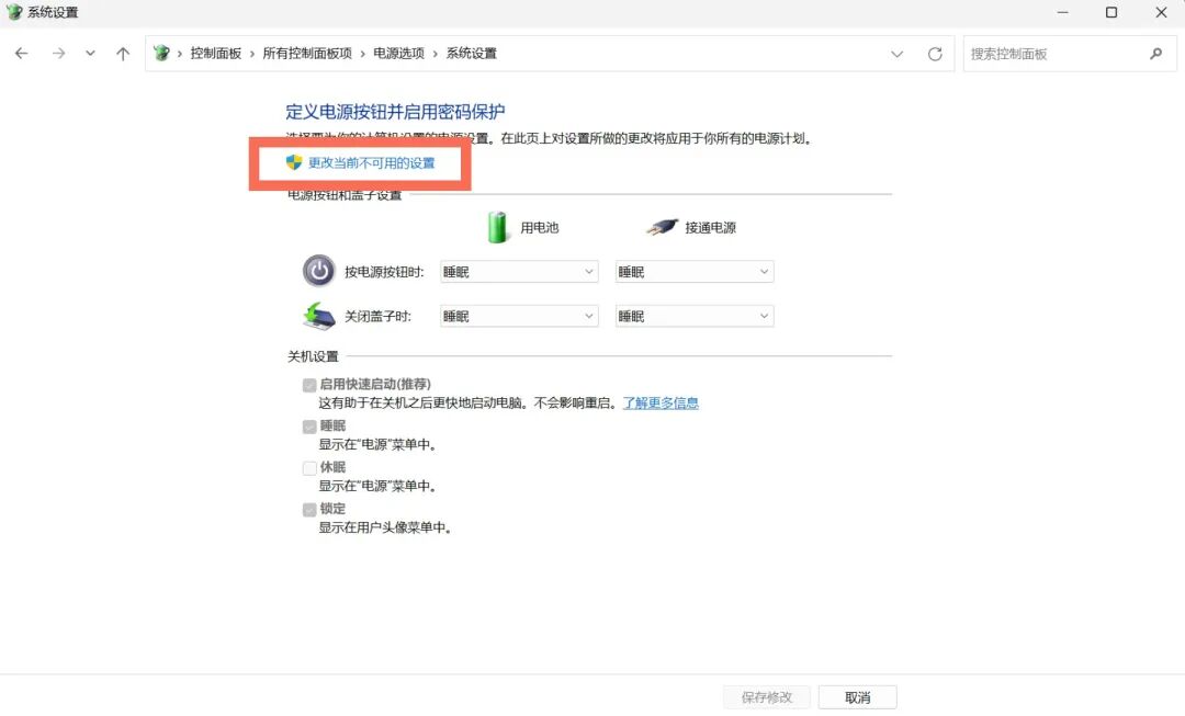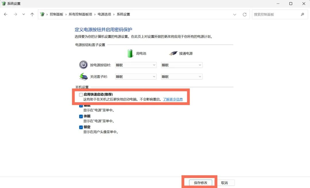 按下Win+Q,搜索【控制面板】,选择【大图标】,选择【电源选项】,左侧点击【选择电源按钮的功能】,点击【更改当前不可用设置】,取消勾选【启用快速启动(推荐)】,点击【保存修改】