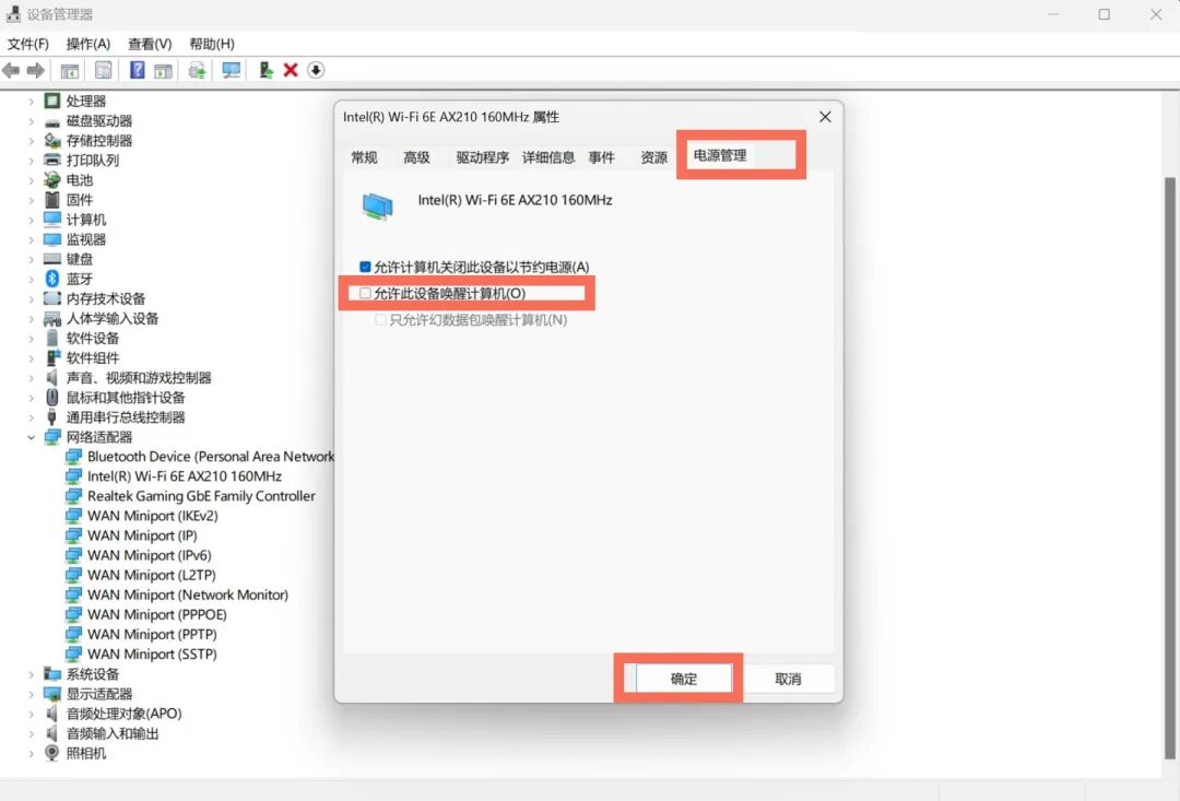按下Win+X,选择设备管理器-网络适配器,右键网卡驱动,选择【属性】,选择【电源管理】,取消勾选【允许此设备唤醒计算机】
