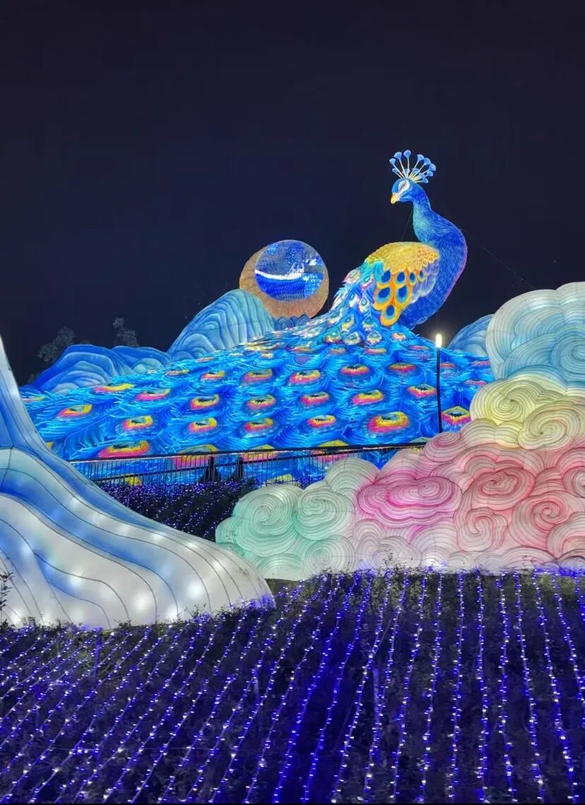 放眼望去,栩栩如生的 “孔雀合屏” 灯组最为夺目,它身披五彩羽衣,尾羽华丽散开,在灯光映照下熠熠生辉,仿若即将振翅高飞,引得众人纷纷驻足拍照。