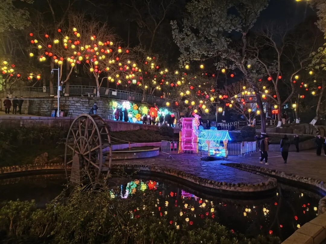 穿过长长的纸伞走廊,灯光倒映在水面上,微风拂过,波光潋滟。大家聚在一起看表演,舞狮、傣族舞、翻跟头……精彩至极,处处都洋溢着热闹喜庆的氛围。