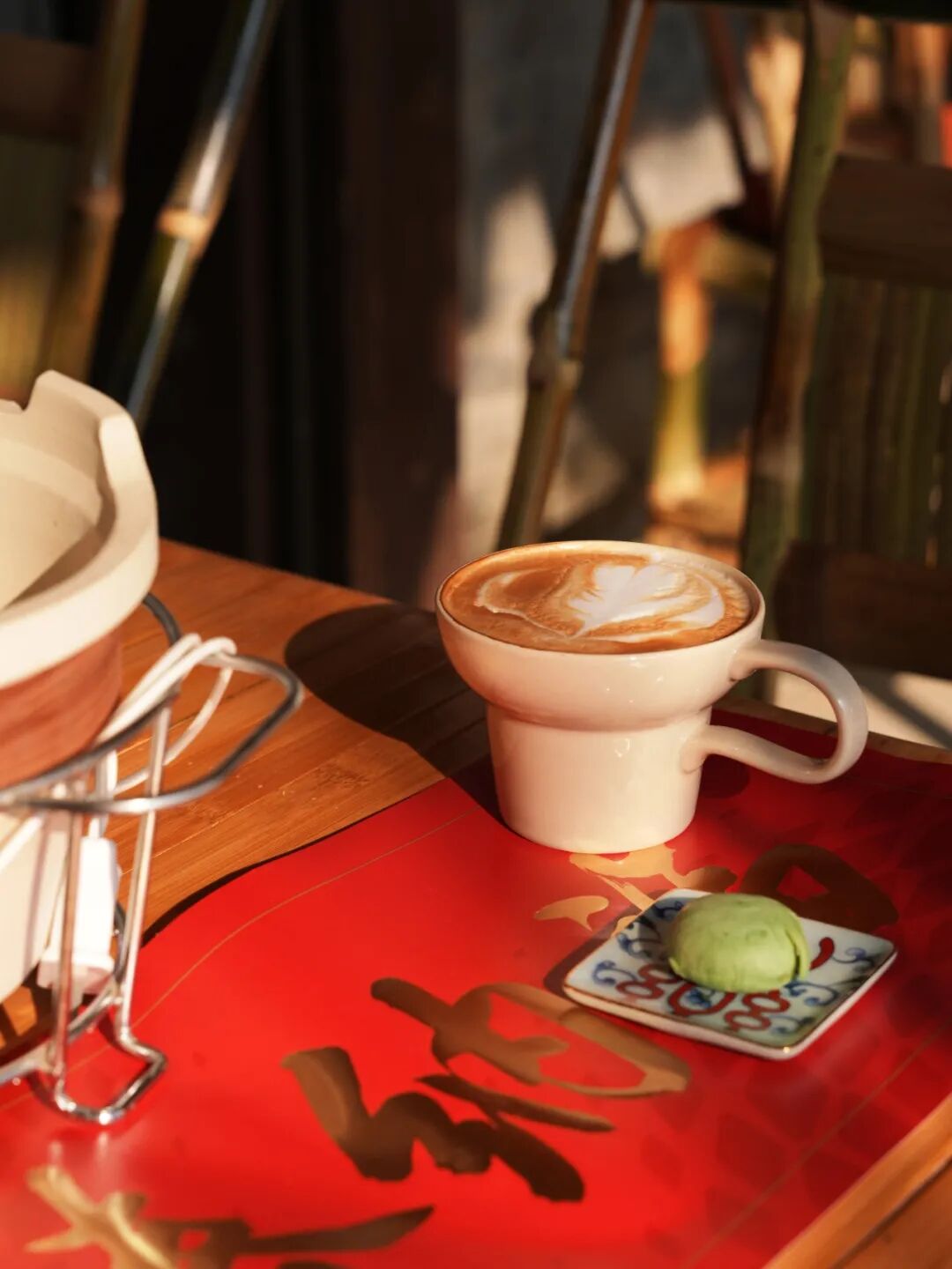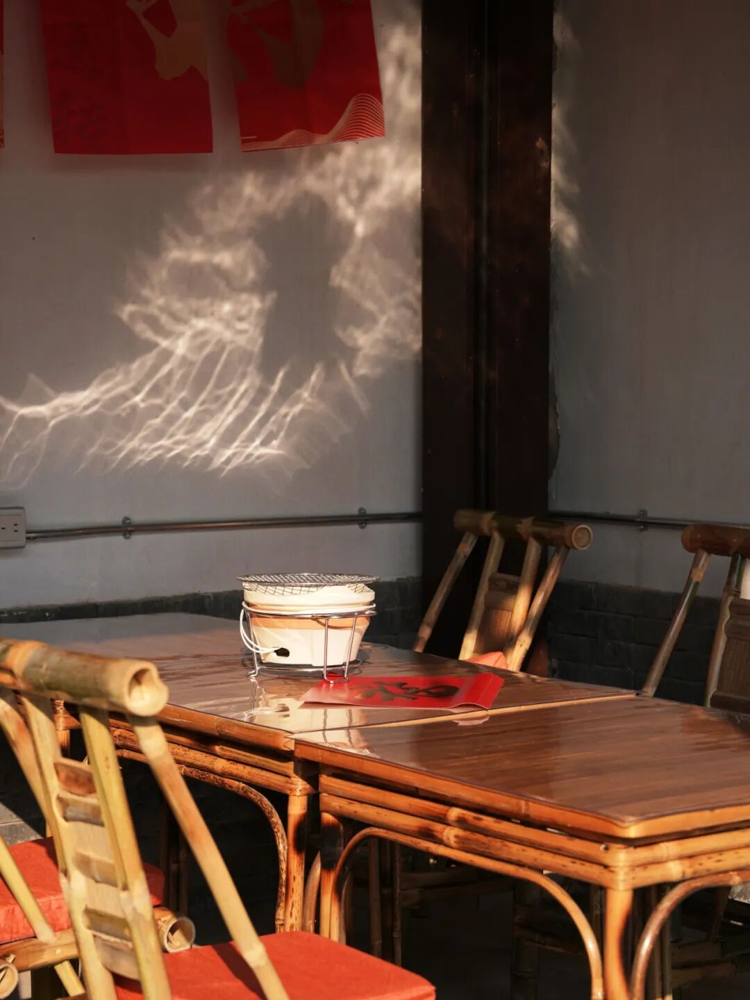 室内室外桌椅充足,布满了新春佳节的装饰,国风氛围浓郁。天气渐暖,午后在院子里围炉煮茶将别有一番风味。试营业期间也有很多创意茶点品尝,据说芝士烤白薯配上一杯茶是绝配。
